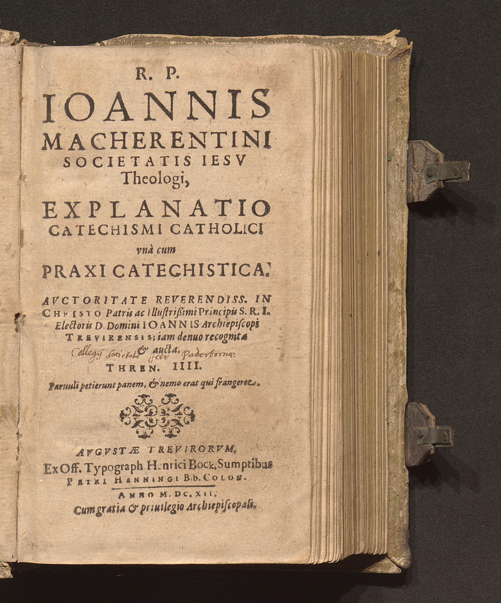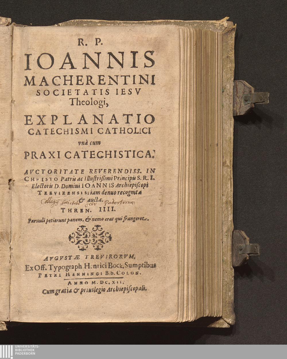 R. P. Ioannis Macherentini Societatis Iesv Theologi, Explanatio Catechismi Catholici : vnà cum Praxi Catechistica ; Avctoritate ... Ioannis Archiepiscopi Trevirensis; iam denuo recognita & aucta