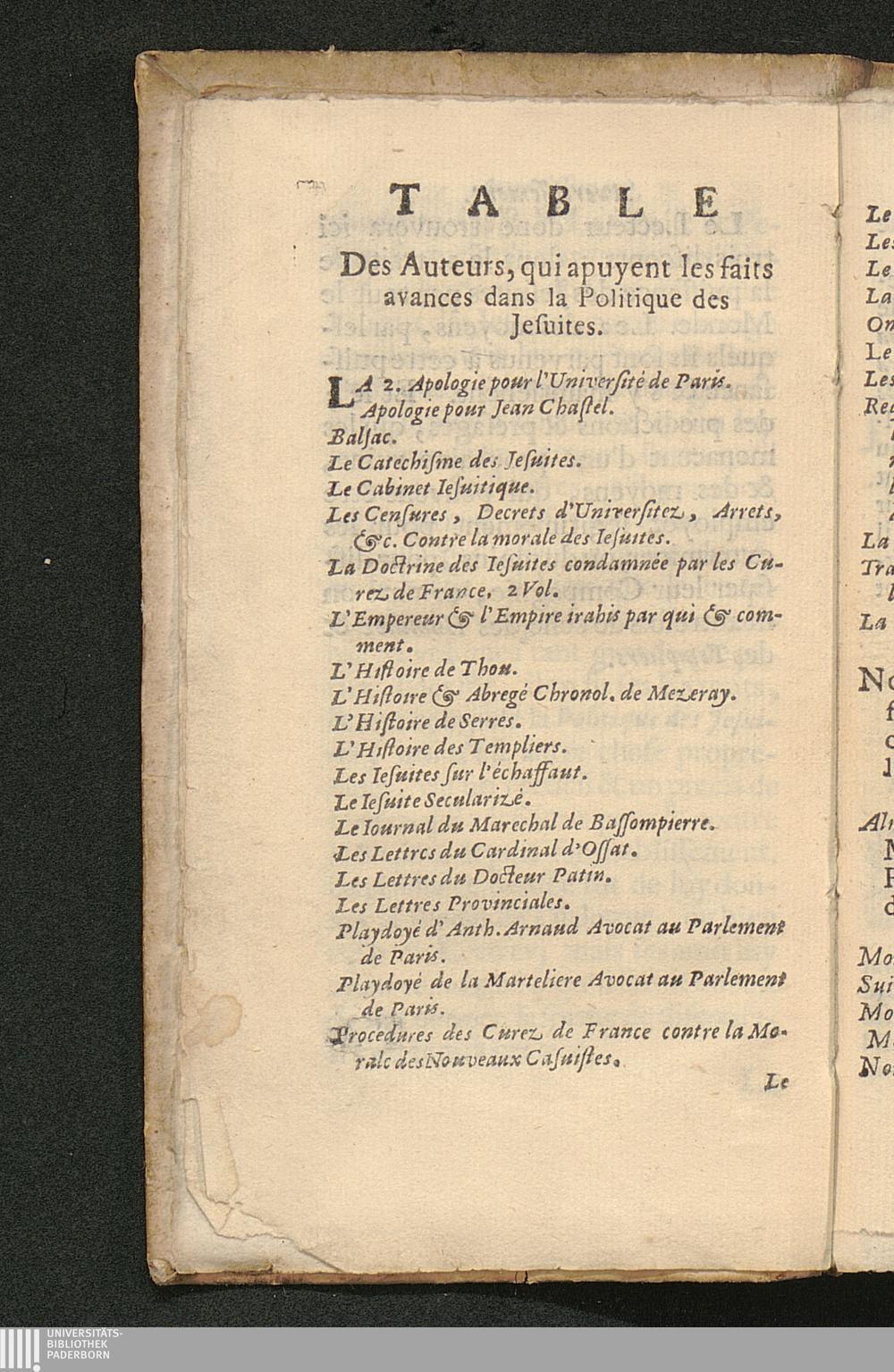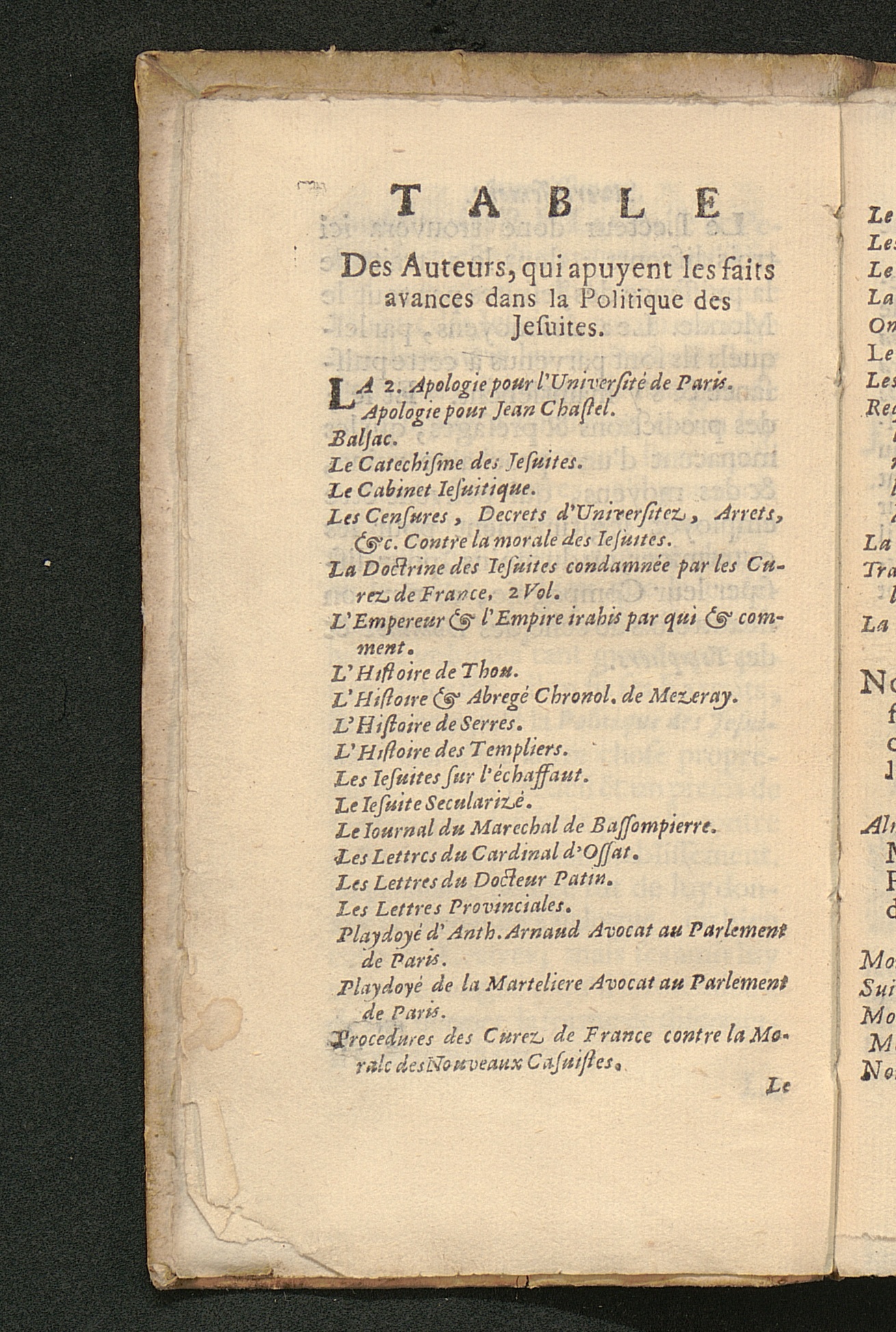 Table Des Auteurs, qui apuyent les faits avances dans la Politique des Jesuites.