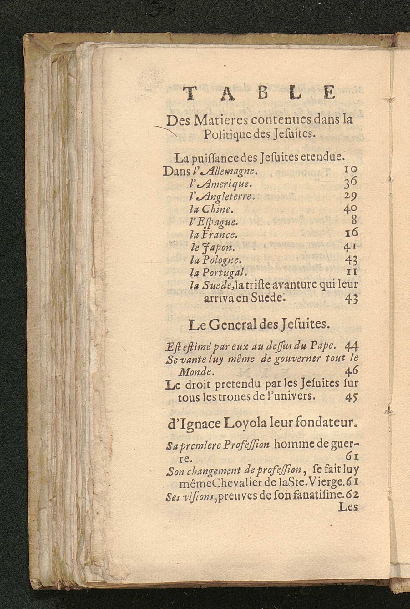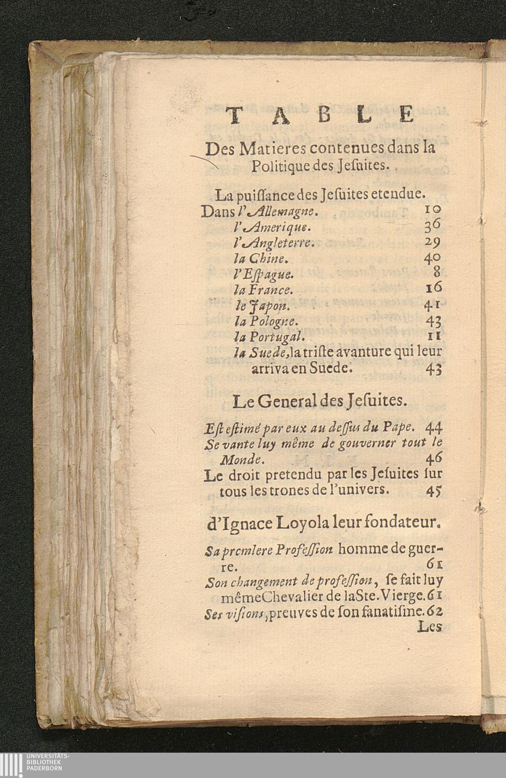 Table Des Matieres contenues dans la Politique des Jesuites.