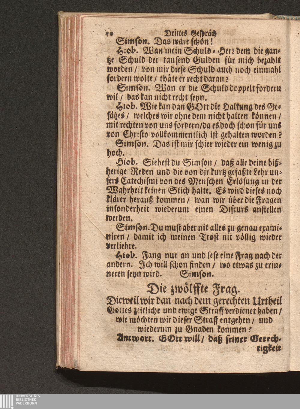 Vier verschiedene Zwischen zweyen Reformirten Bürgern Hiob Und Simson Angestellte Discourse Uber den so genanten Reformirten Heidelberger Catechismum, : Jn welchen Alle in demselben enthaltene 129. Fragen abgehandelt, Und was in einer jeglichen insonderheit zu mercken/ Auff das deutlichste erkläret wird / [Georg Kauffmann]