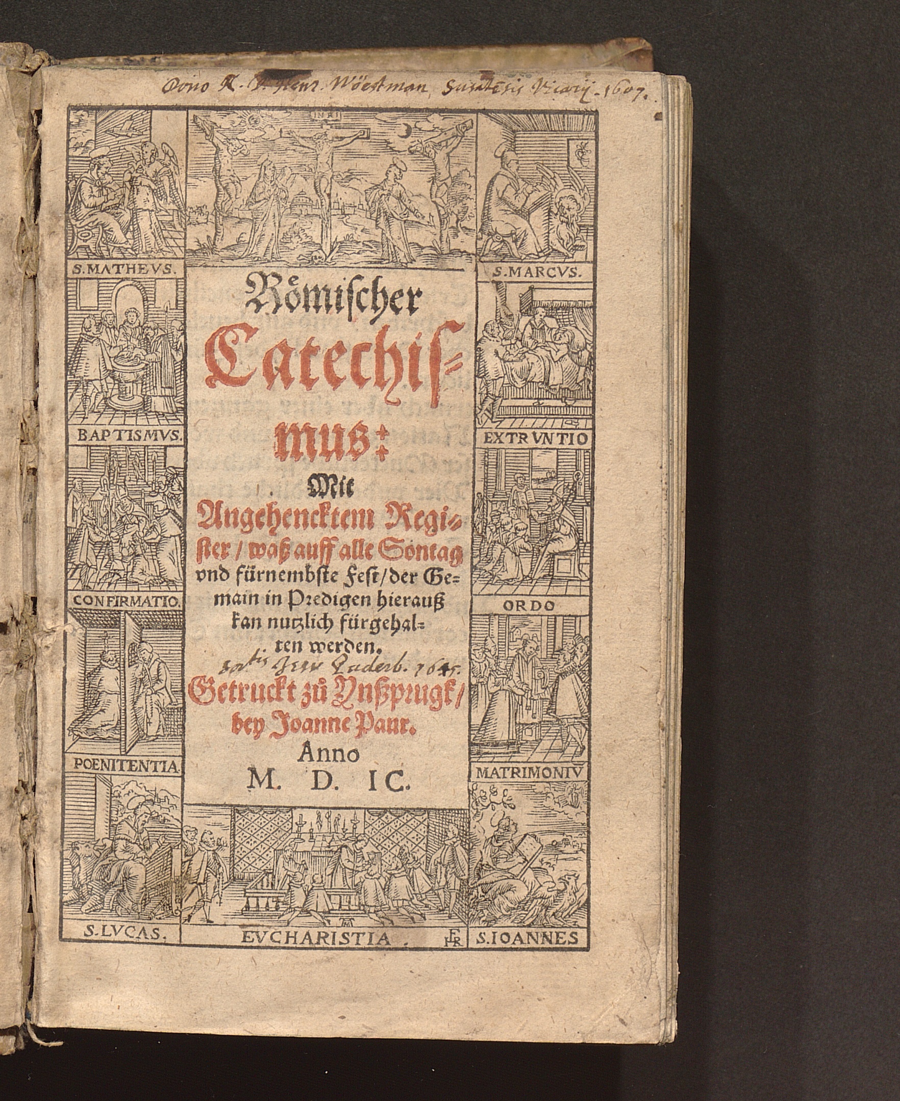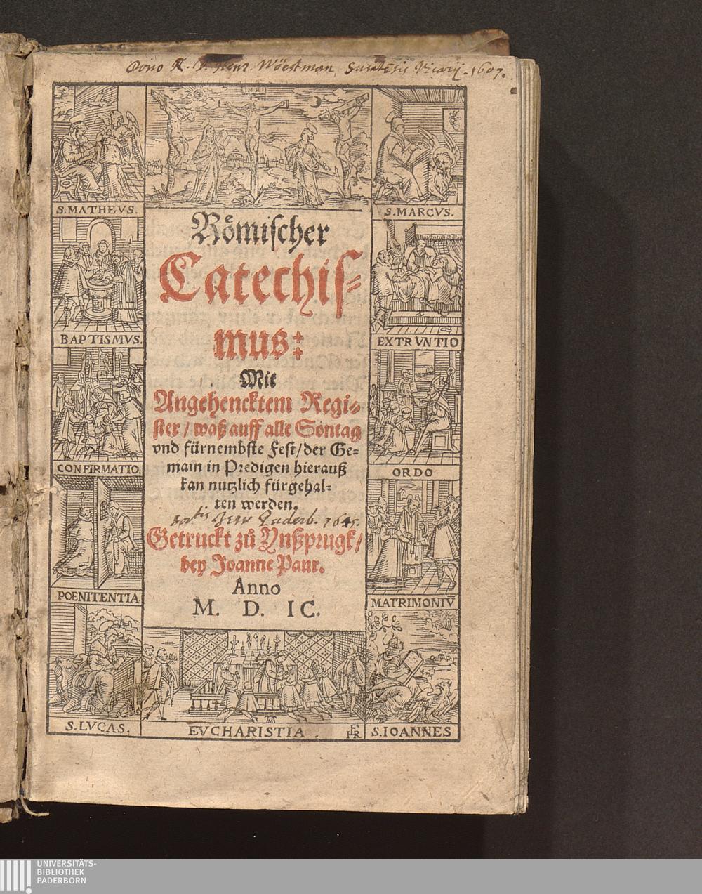 Römischer Catechismus : Mit Angehencktem Register/ waß auff alle Sontag vnd fürnembste Fest/ der Gemain in Predigen hierauß kan nutzlich fürgehalten werden