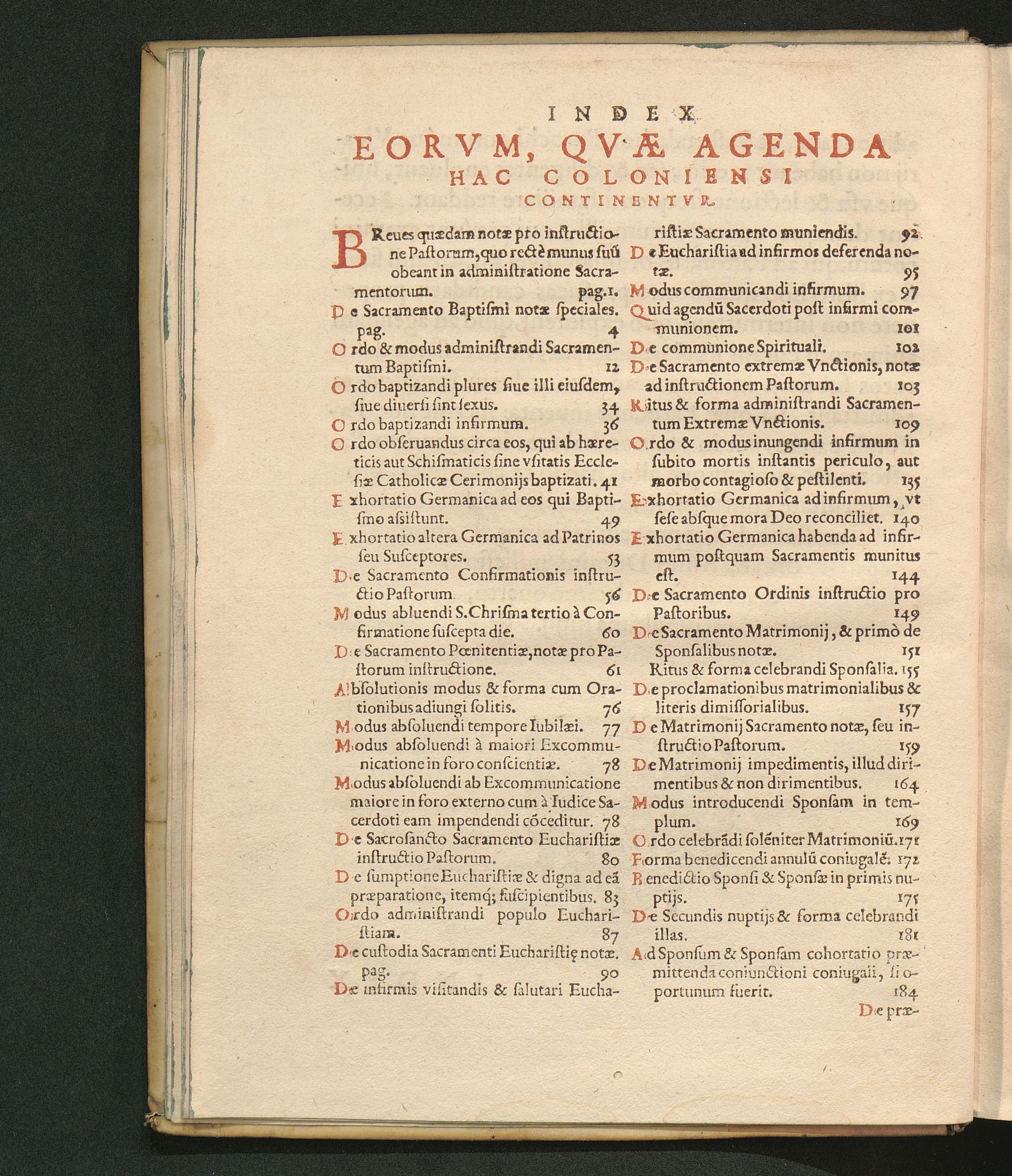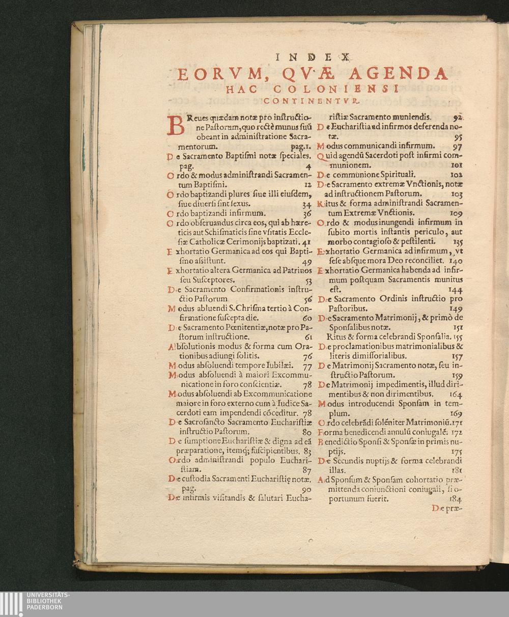 Agenda S. Coloniensis Ecclesiæ. Hoc Est: Liber Pastoralis : In Qvo Continentvr, Qvæ In Sacramentis Administrandis, Aliisqve ritibvs Sacris peragendis, ad Parochorum, ac Sacerdotum animarum curam habentium, officium spectant / Jvssv Et Avctoritate R.mi Et S.mi D. D. Ferdinandi, Archiepiscopi Coloniensis, &c. ad vsum archidiœcesis Coloniensis euulgata