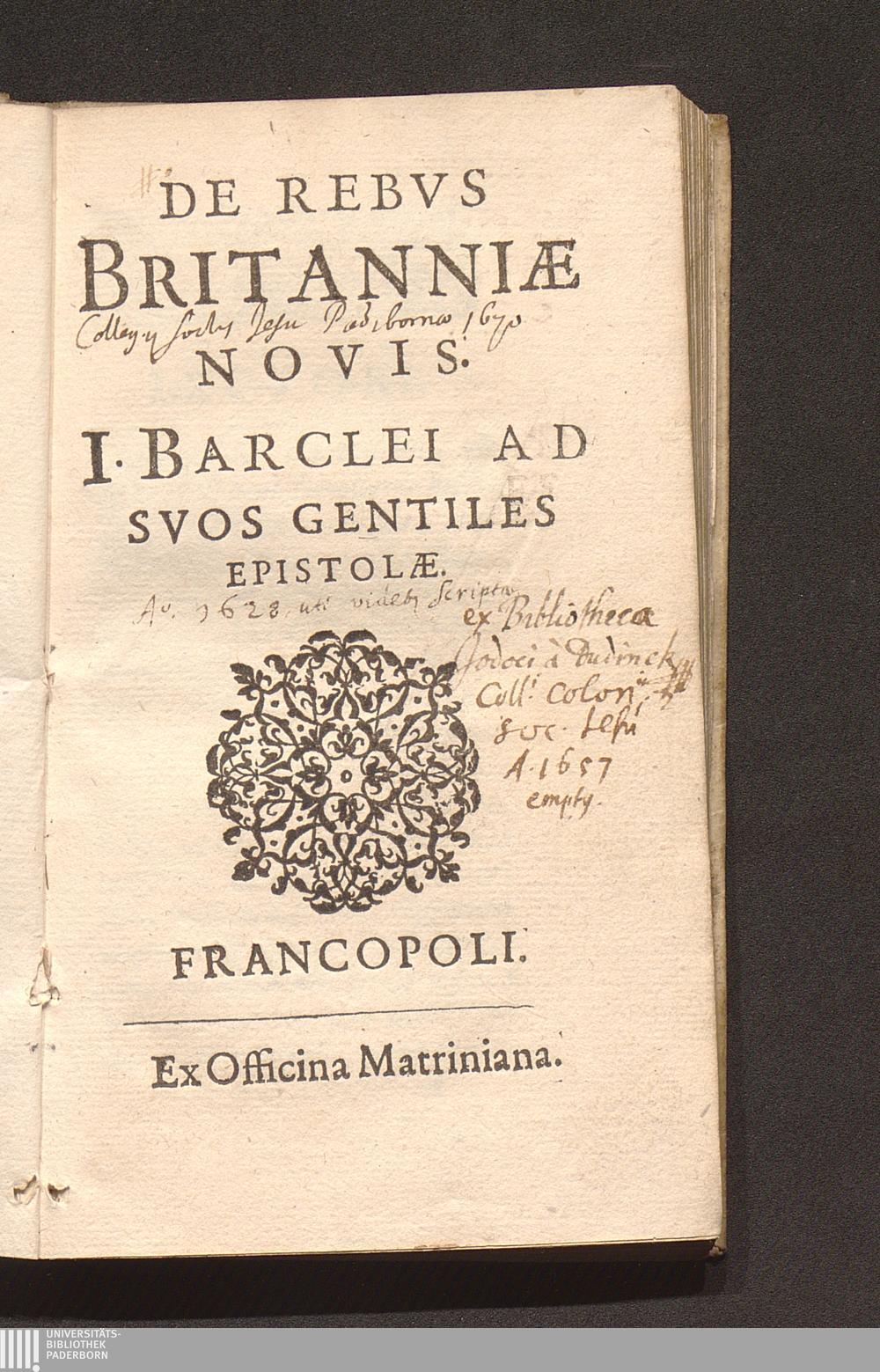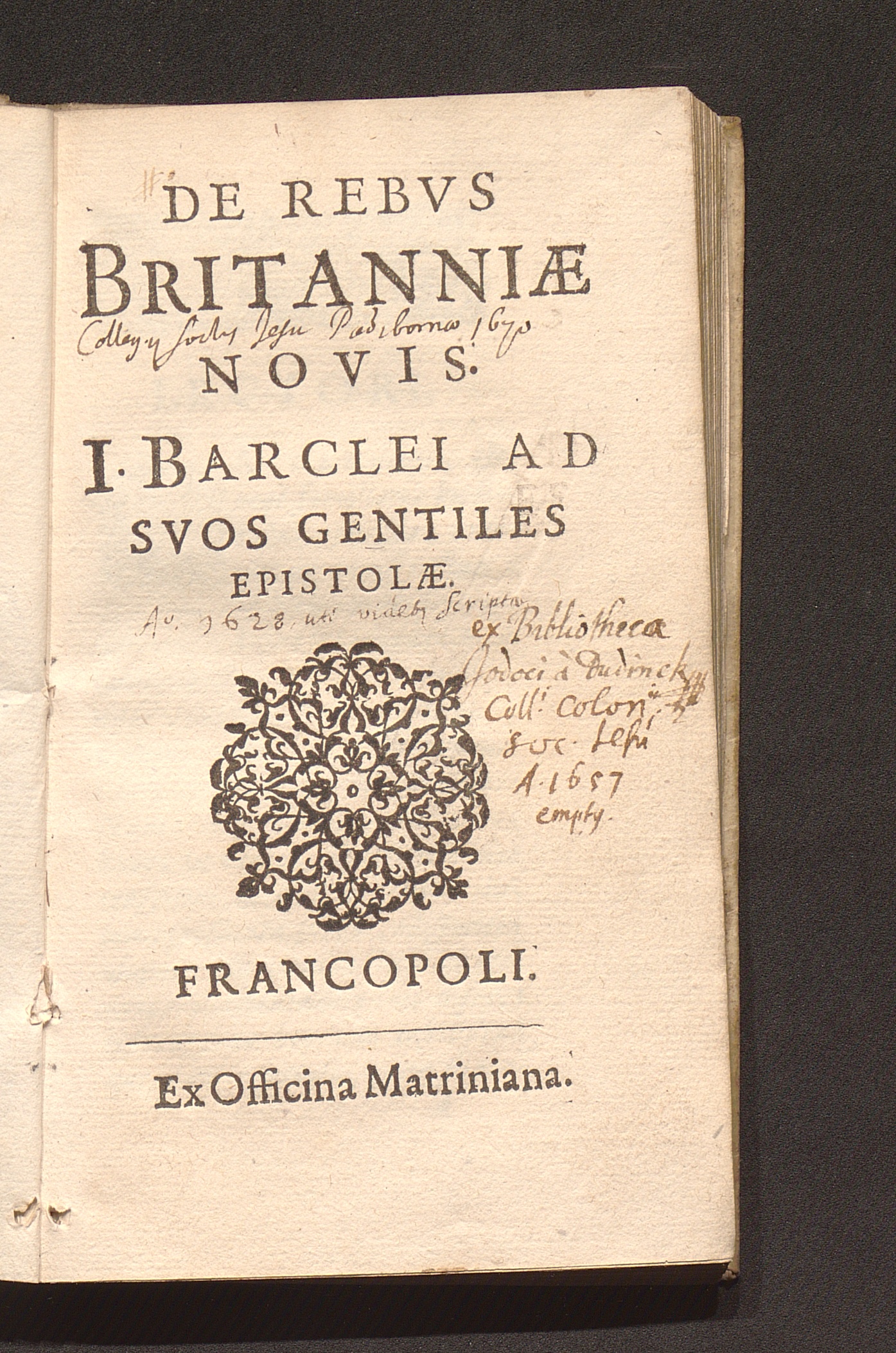 De Rebvs Britanniæ Novis : I. Barclei Ad Svos Gentiles Epistolæ