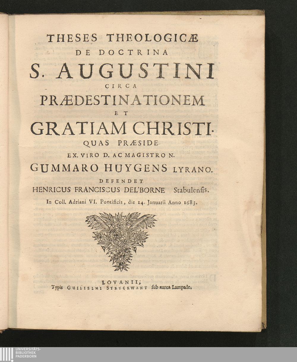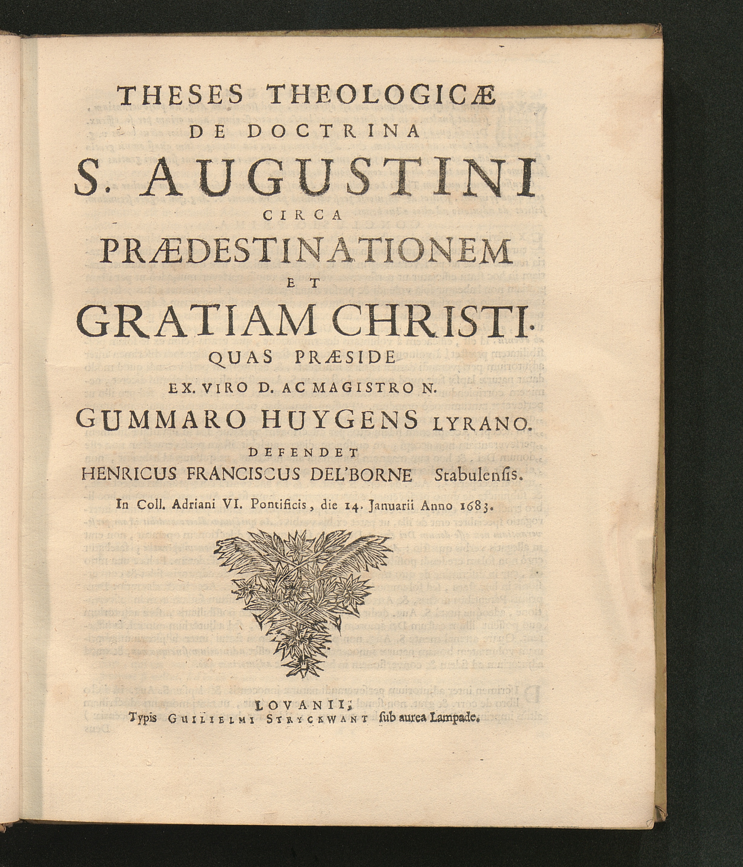 Theses Theologicæ De Doctrina S. Augustini Circa Prædestinationem Et Gratiam Christi / Quas Præside Ex. Viro D. Ac Magistro N. Gummaro Huygens Lyrano. Defendet Henricus Franciscus Del'Borne Stabulensis. In Coll. Adriani VI. Pontificis, die 14. Januarii anno 1683