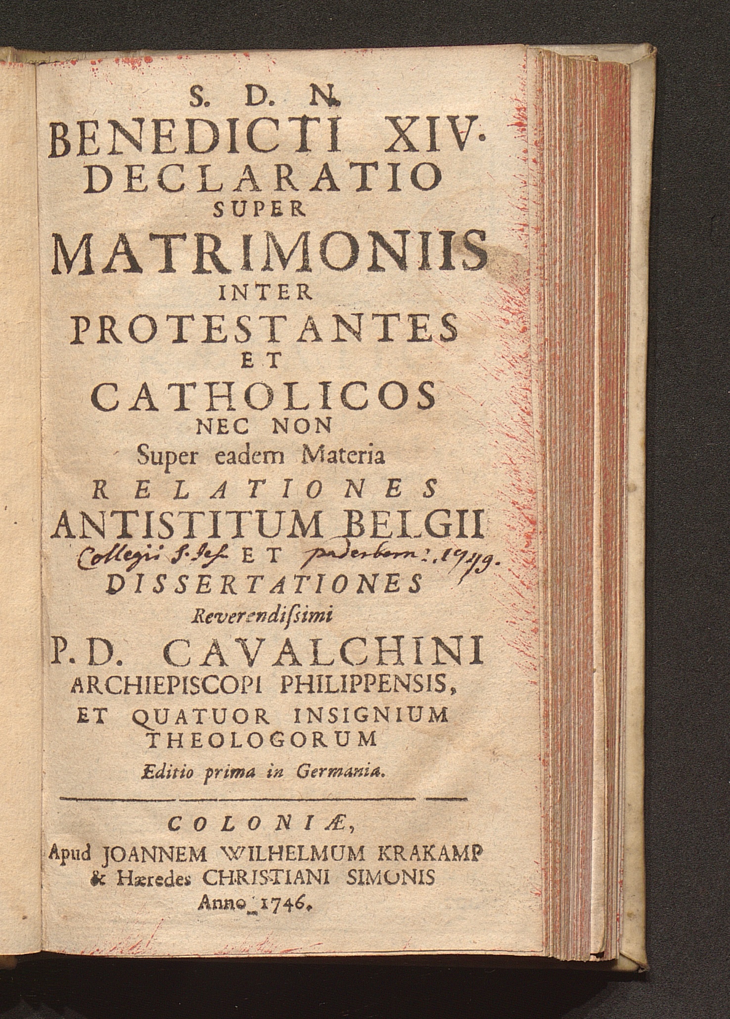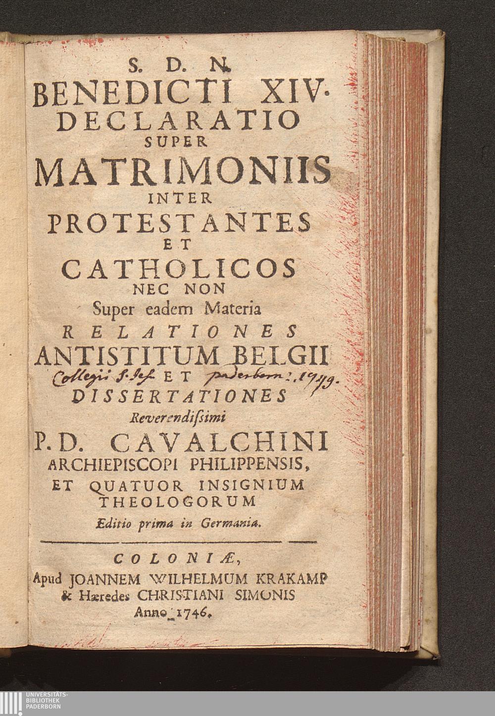 S. D. N. Benedicti XIV. Declaratio Super Matrimoniis Inter Protestantes Et Catholicos