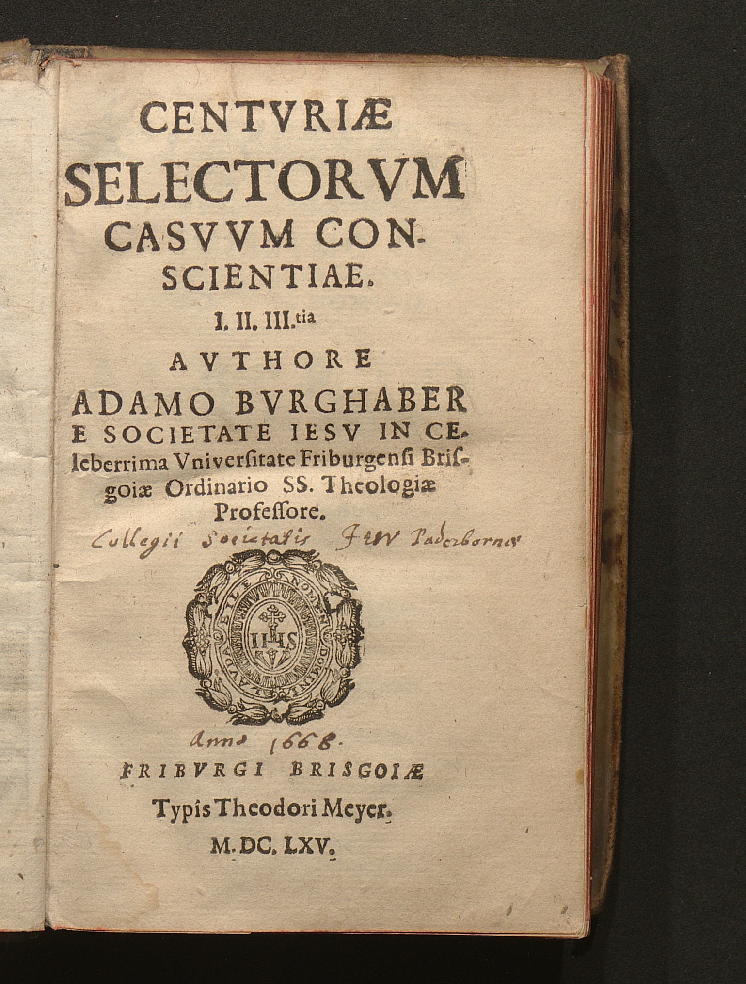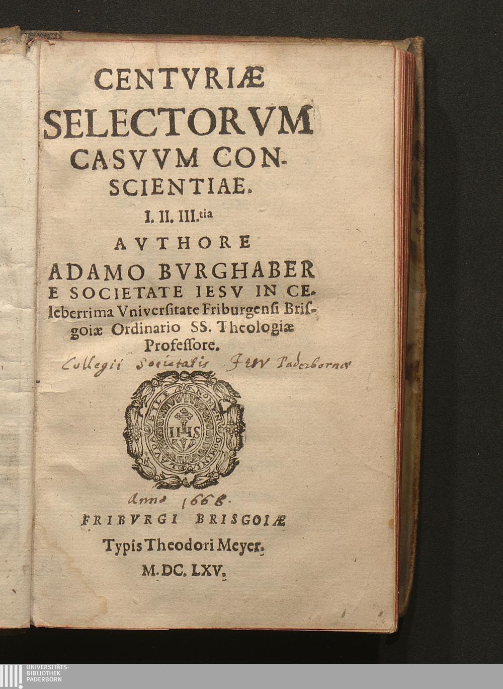Centvriæ Selectorvm Casvvm Conscientiae. I. II. III.tia / Avthore Adamo Bvrghaber E Societate Iesv In Celeberrima Vniversitate Friburgensi Brisgoiæ Ordinario SS. Theologiæ Professore