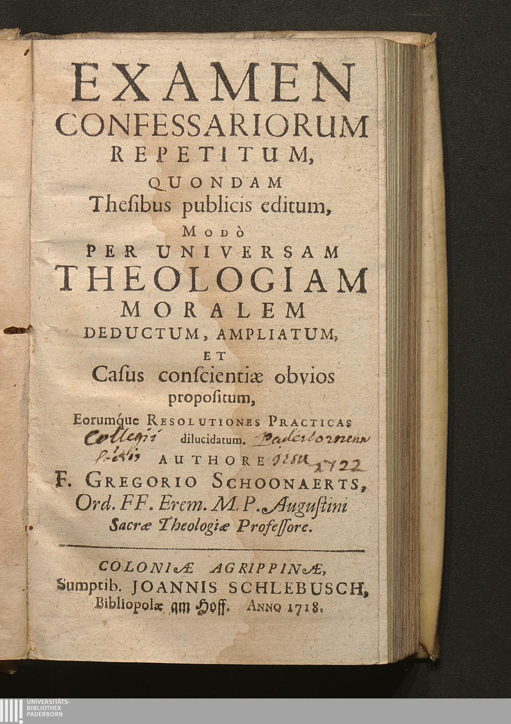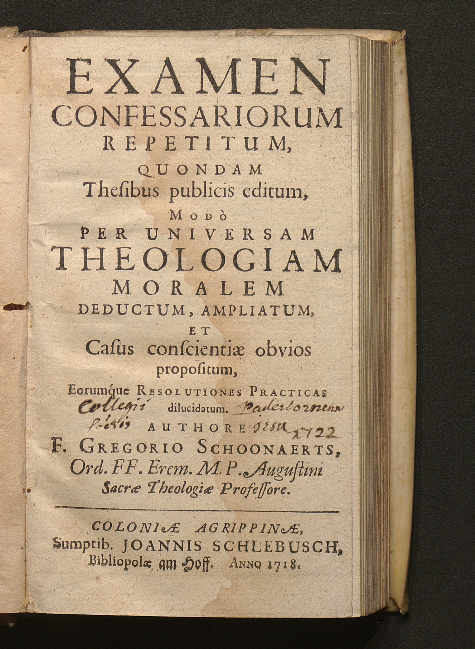 Examen Confessariorum Repetitum : Quondam Thesibus publicis editum, Modò Per Universam Theologiam Moralem Deductum, Ampliatum, Et Casus conscientiæ obvios propositum, Eorumque Resolutiones Practicas dilucidatum / Authore F. Gregorio Schoonaerts, Ord. FF. Erem. M. P. Augustini Sacræ Theologiæ Professore