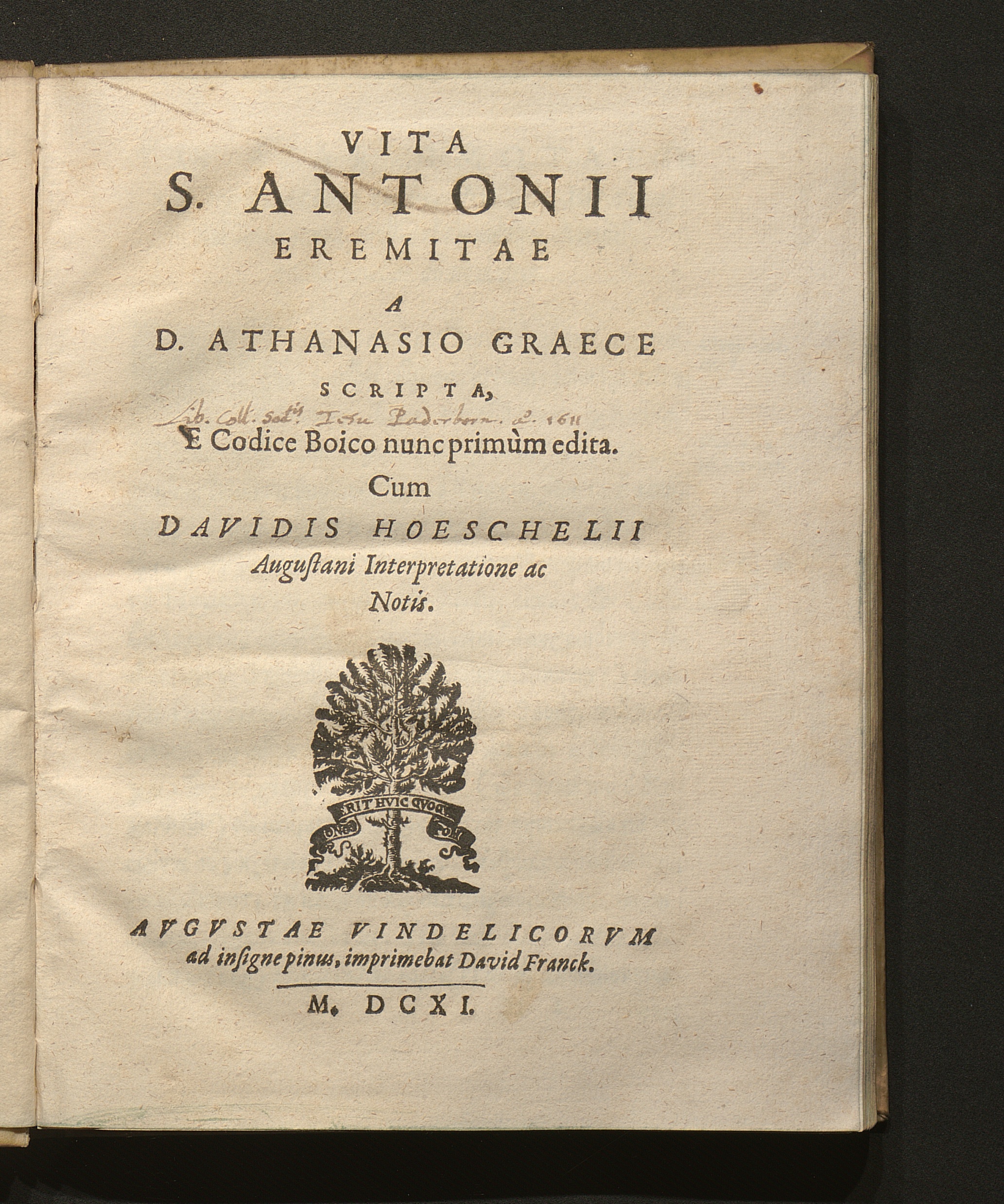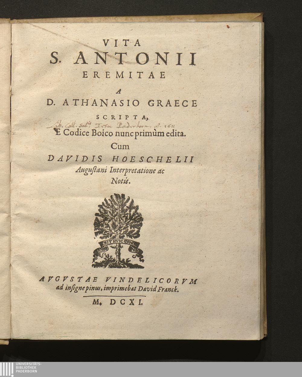 Vita S. Antonii Eremitae / A D. Athanasio Graece Scripta, E Codice Boico nunc primùm edita. Cum Davidis Hoeschelii Augustani Interpretatione ac Notis