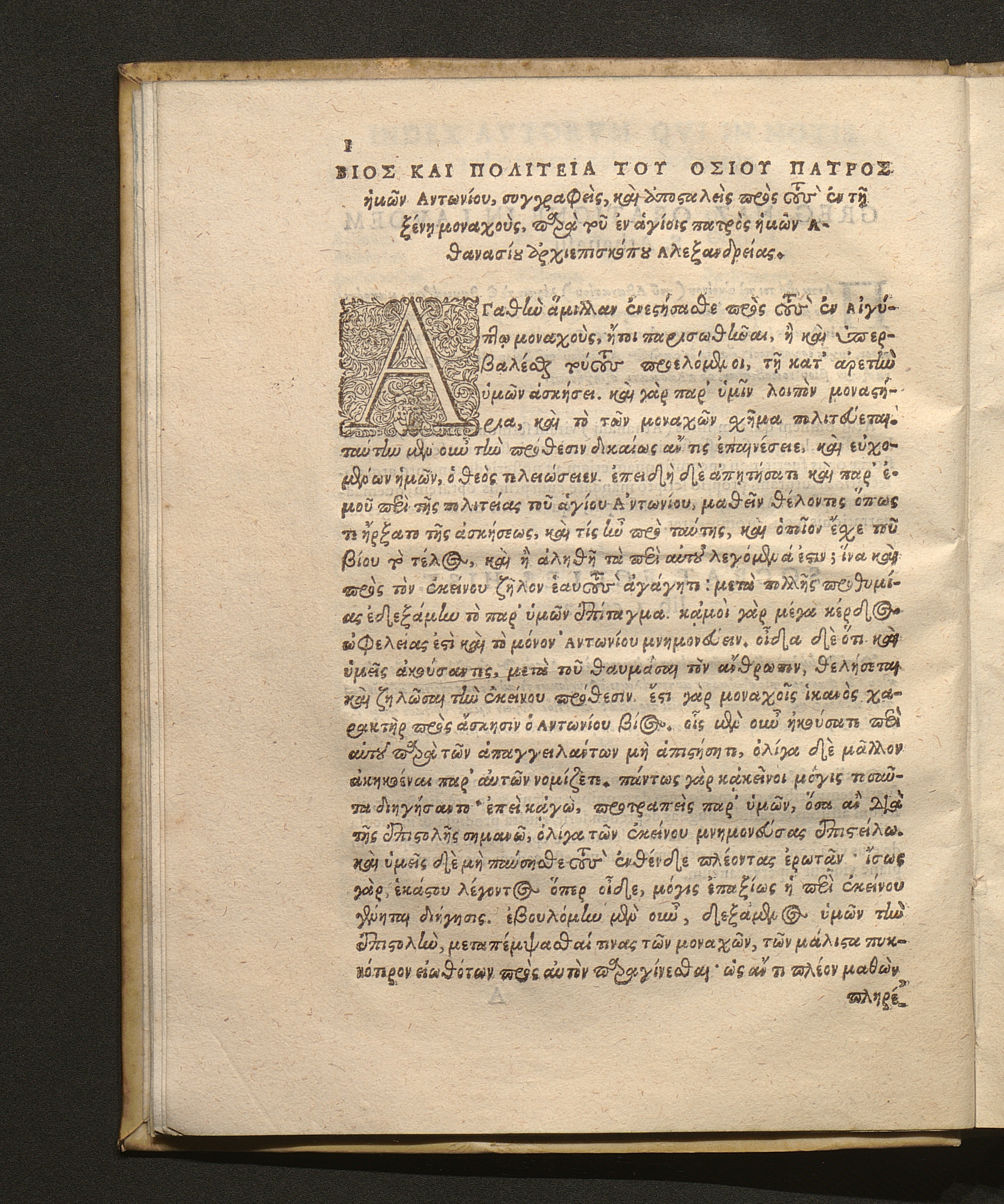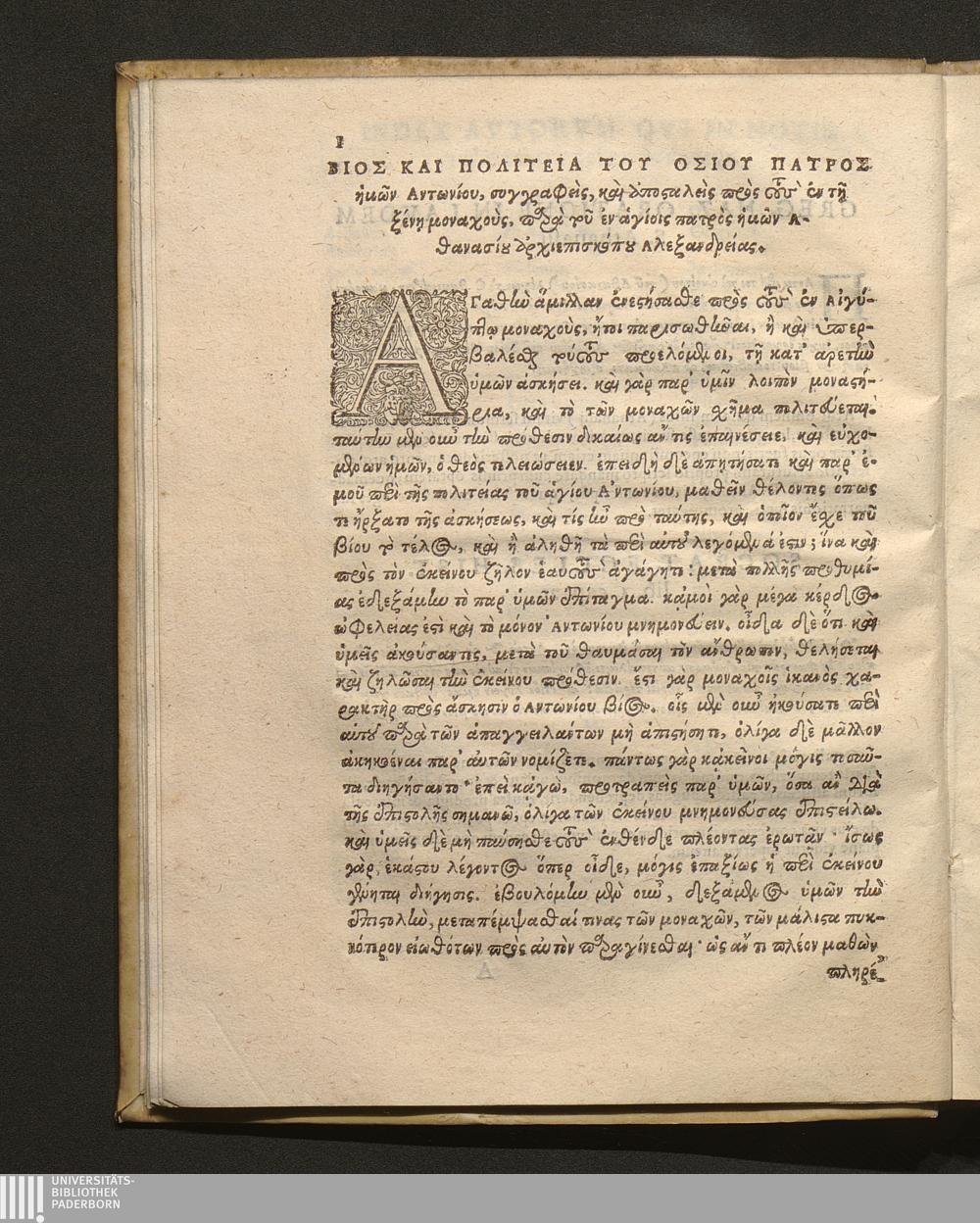 Βιος Και Ρολιτεια του Οσιου Πατρος ήμων Αντωνιου ... = Vita S. Patris Nostri Antonii, conscripta & missa ad monachos peregrinos à D. patre Athanasio, Alexandriӕ archiepiscopo.