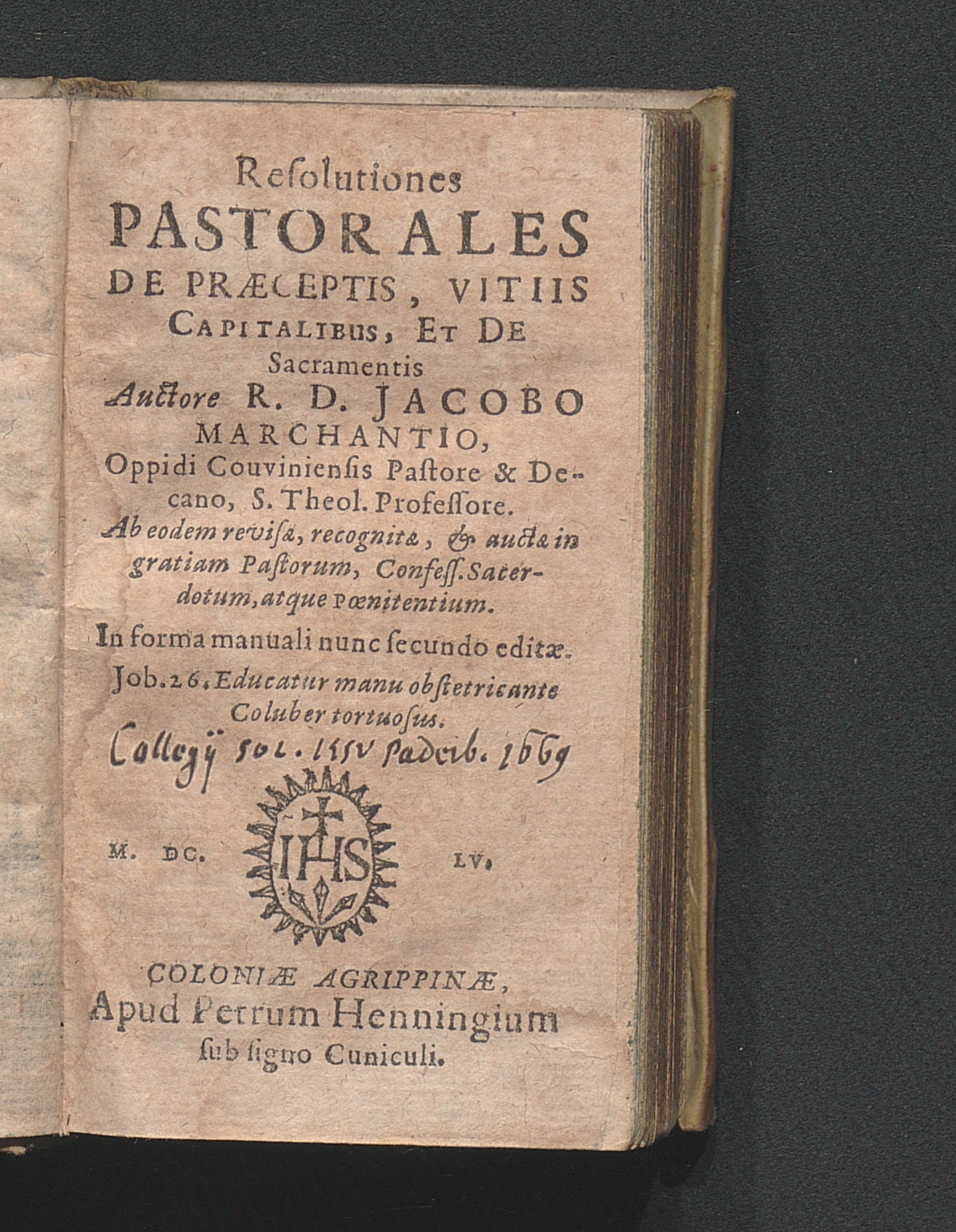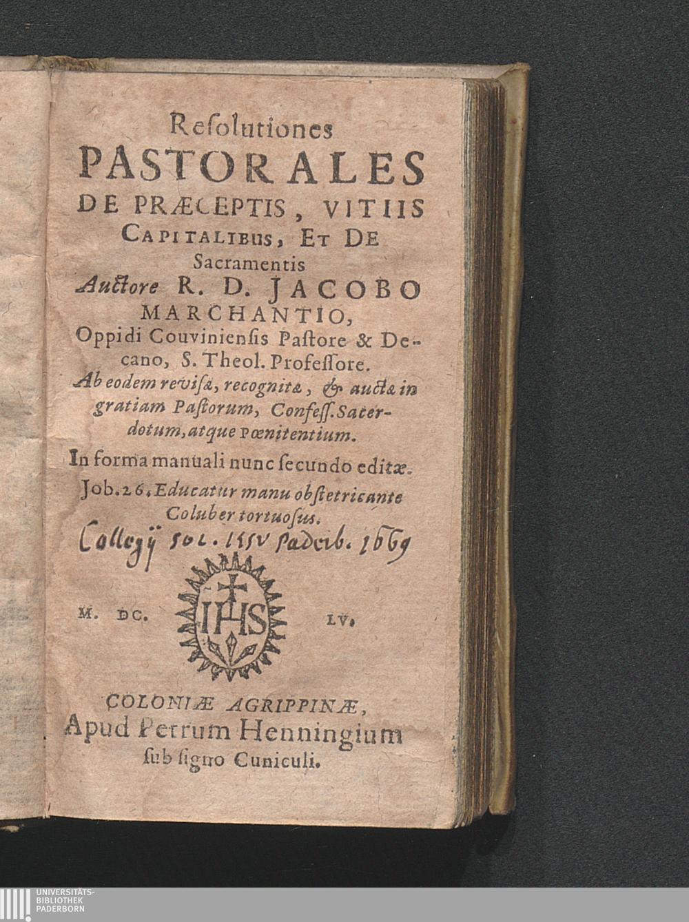 Resolutiones Pastorales De Præceptis, Vitiis Capitalibus, Et De Sacramentis / Auctore R. D. Jacobo Marchantio, Oppidi Couviniensis Pastore & Decano, S. Theol. Professore