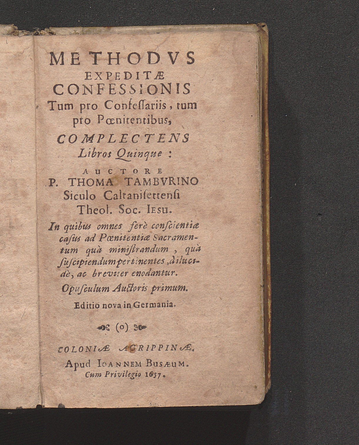 Methodvs Expeditæ Confessionis Tum pro Confessarijs, tum pro Pœnitentibus : Complectens Libros Quinque / Auctore P. Thoma Tambvrino Siculo Caltanisettensi Theol. Soc. Iesu