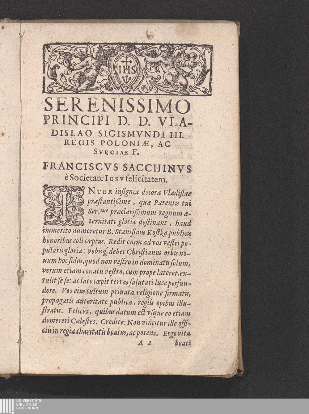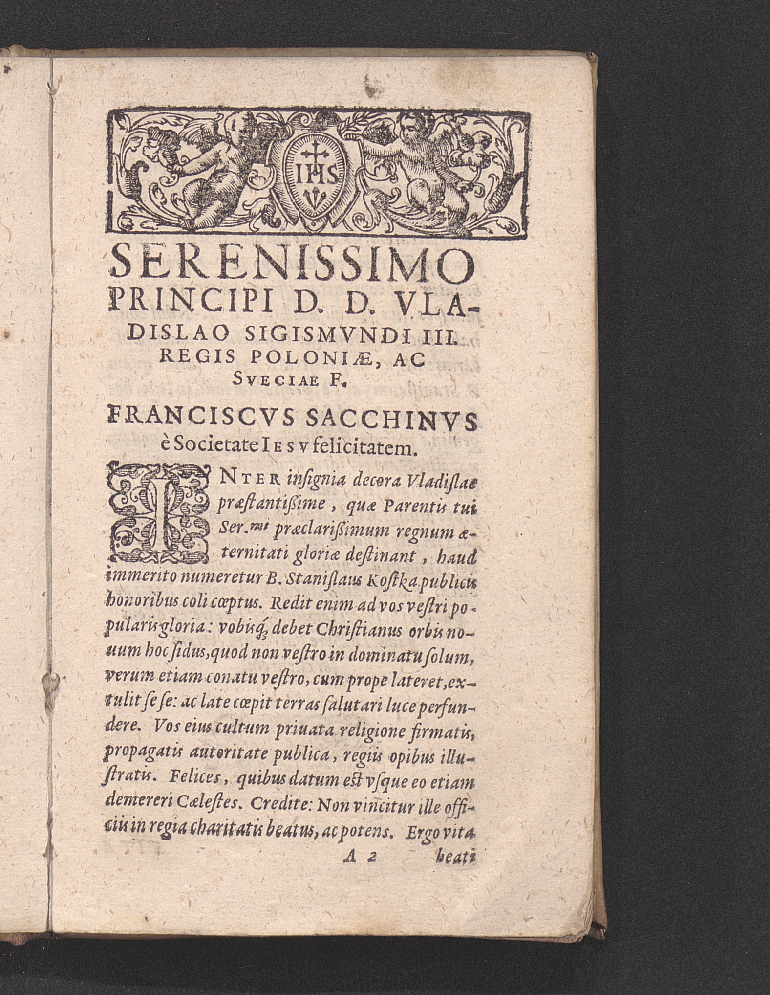 Serenissimo Principi D. D. Vladislao Sigismvndi III. Regis Poloniæ, Ac Sveciæ F. Franciscvs Sacchinvs è Societate Iesv felicitatem.