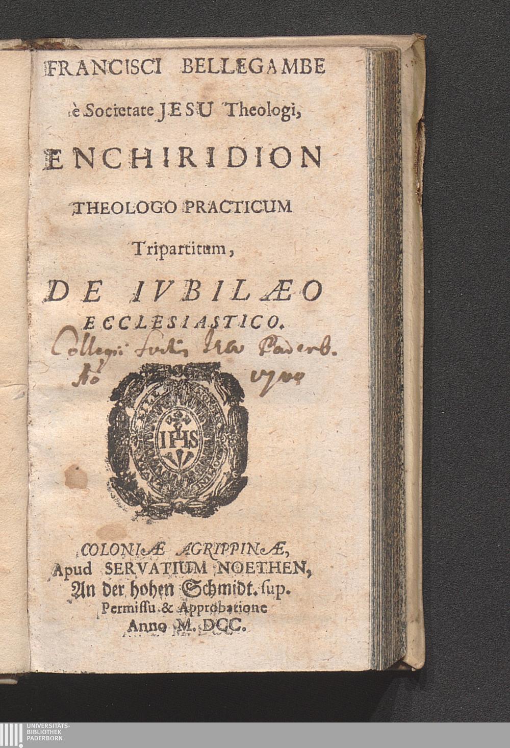 Francisci Bellegambe è Societate Jesu Theologi, Enchiridion Theologo Practicum Tripartitum, De Ivbilæo Ecclesiastico