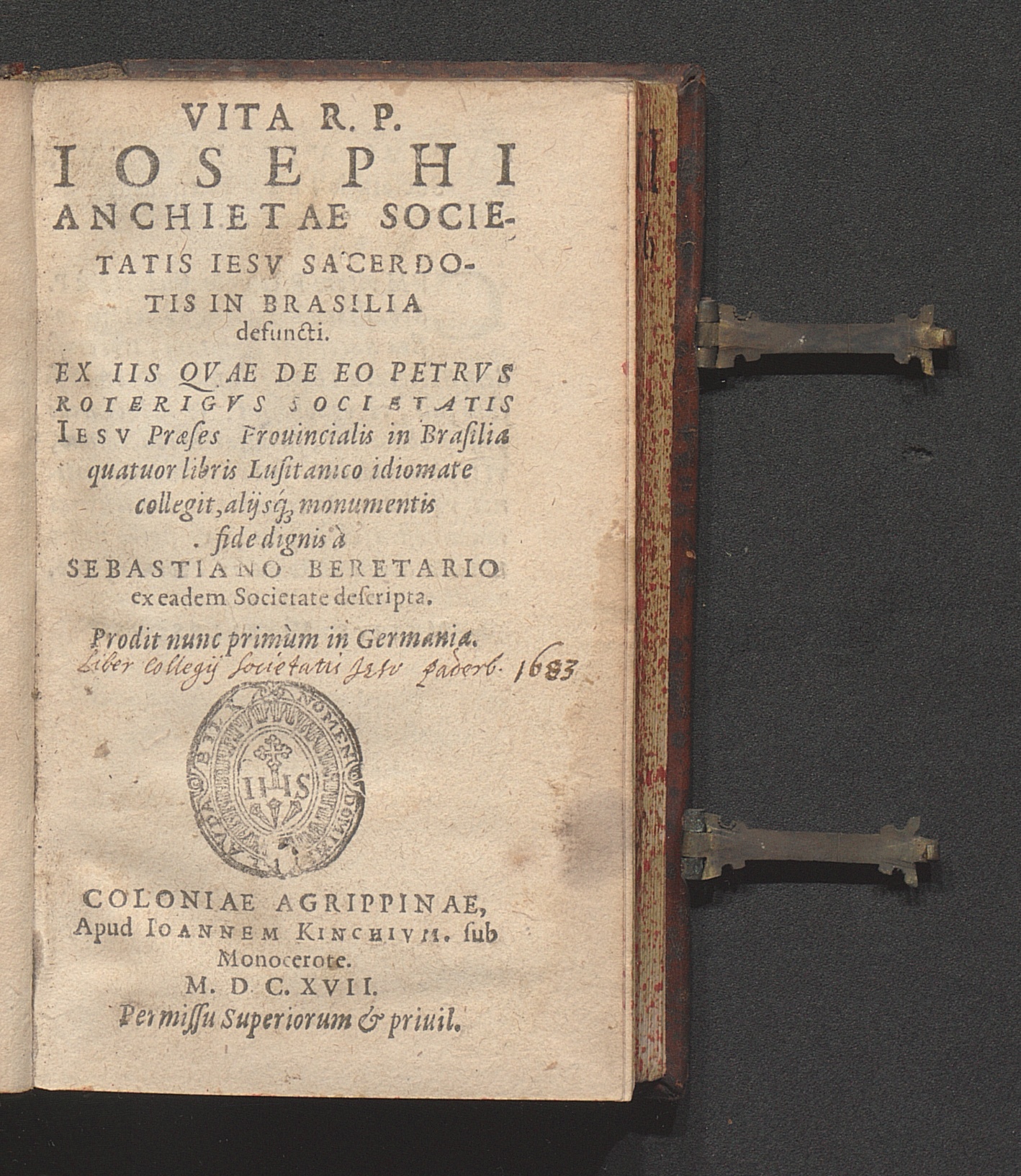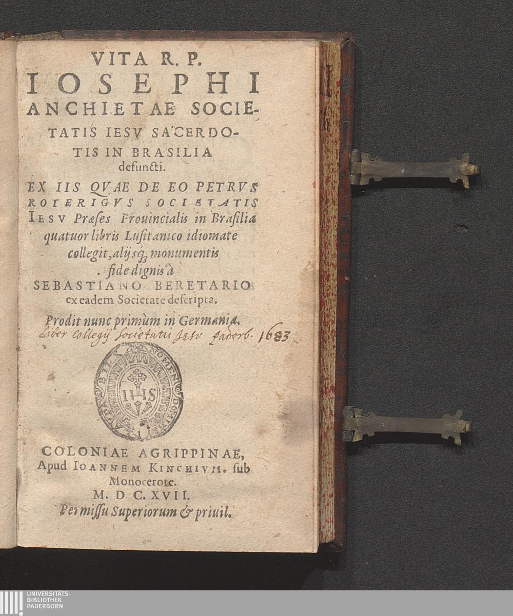 Vita R. P. Iosephi Anchietae Societatis Iesv Sacerdotis In Brasilia defuncti / Ex Iis Qvae De Eo Petrvs Roterigvs Societatis Iesv Præses Prouincialis in Brasilia quatuor libris Lusitanico idiomate collegit, aliisq[ue] monumentis fide dignis à Sebastiano Beretario ex eadem Societate descripta