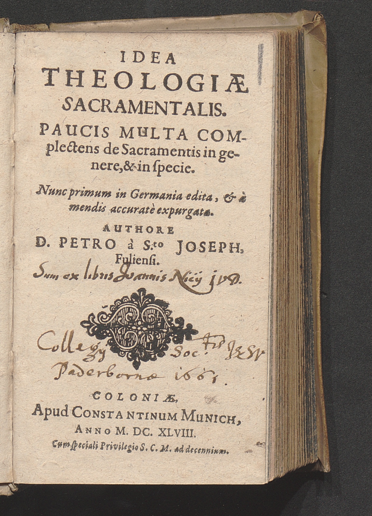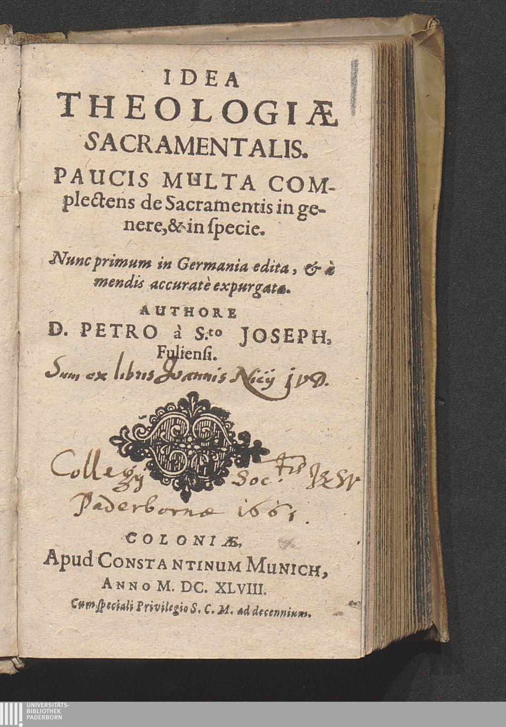 Idea Theologiæ Sacramentalis : Paucis Multa Complectens de Sacramentis in genere, & in specie / Authore D. Petro à S.to Joseph, Fuliensi