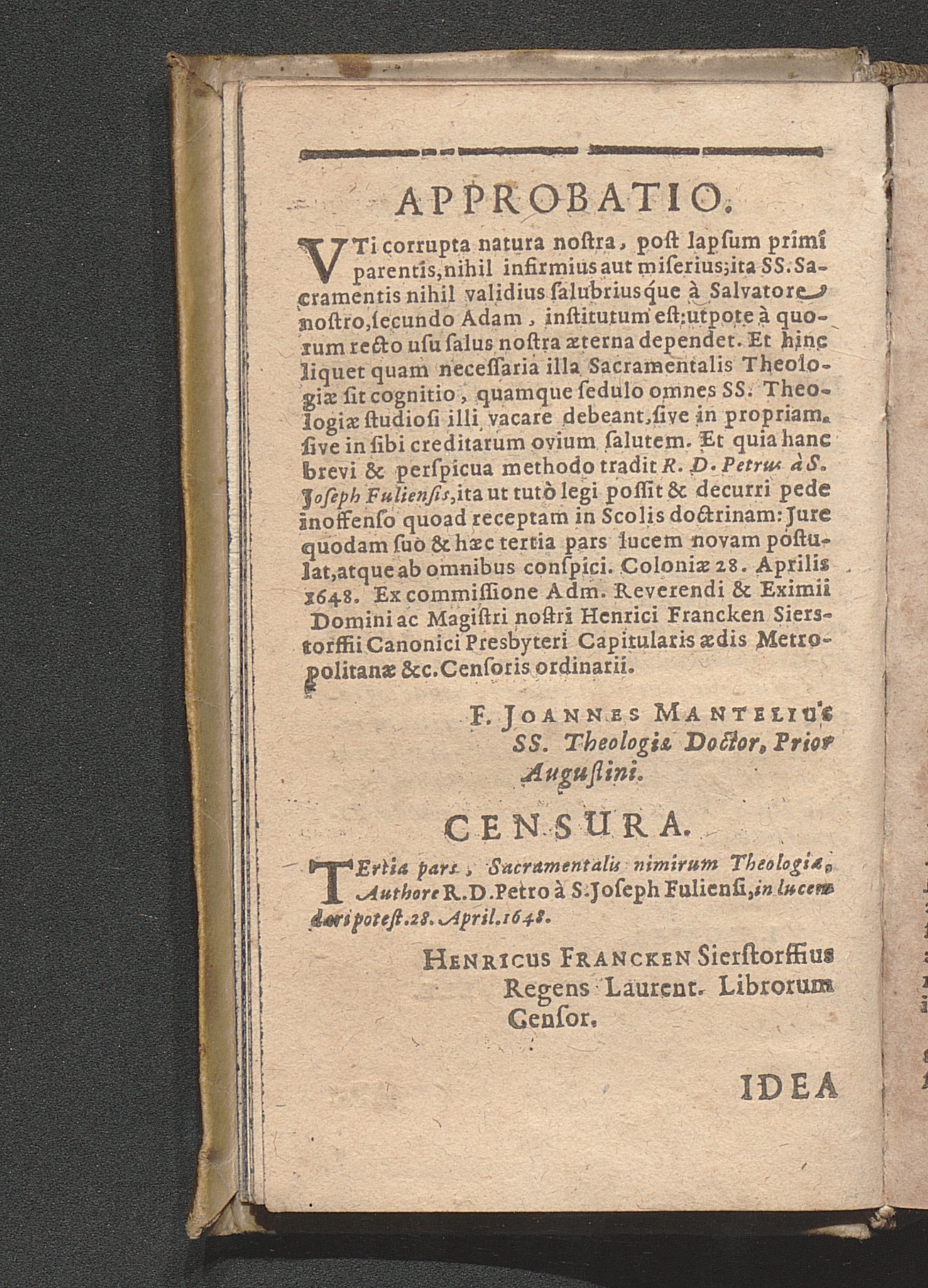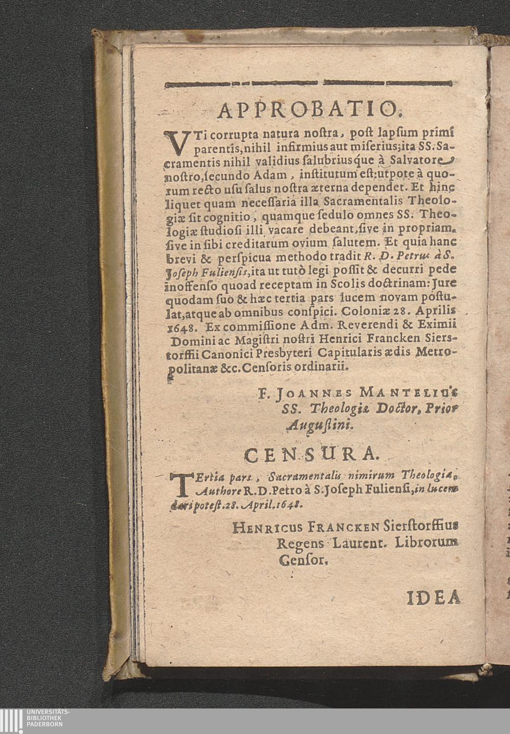 Idea Theologiæ Sacramentalis : Paucis Multa Complectens de Sacramentis in genere, & in specie / Authore D. Petro à S.to Joseph, Fuliensi