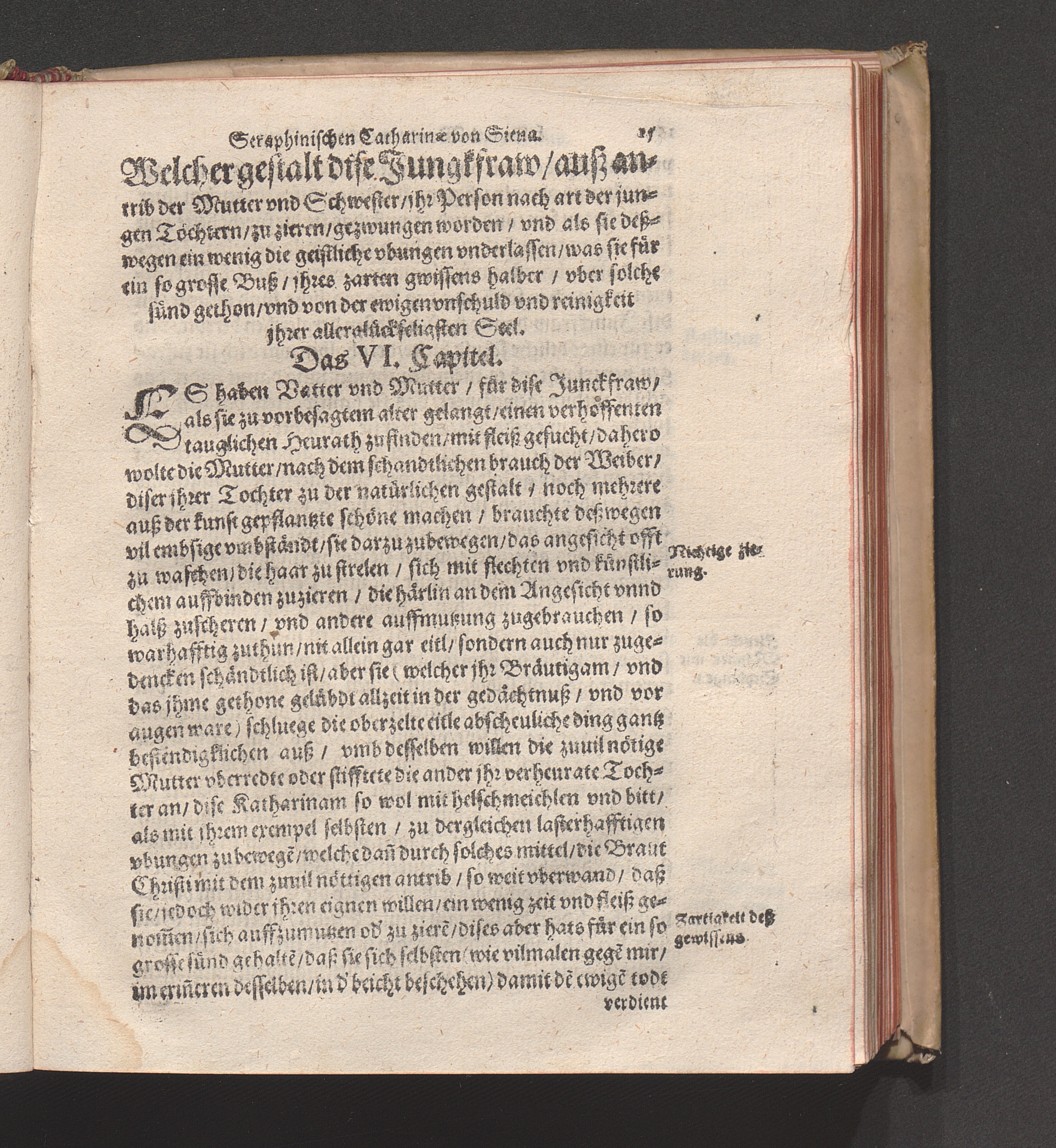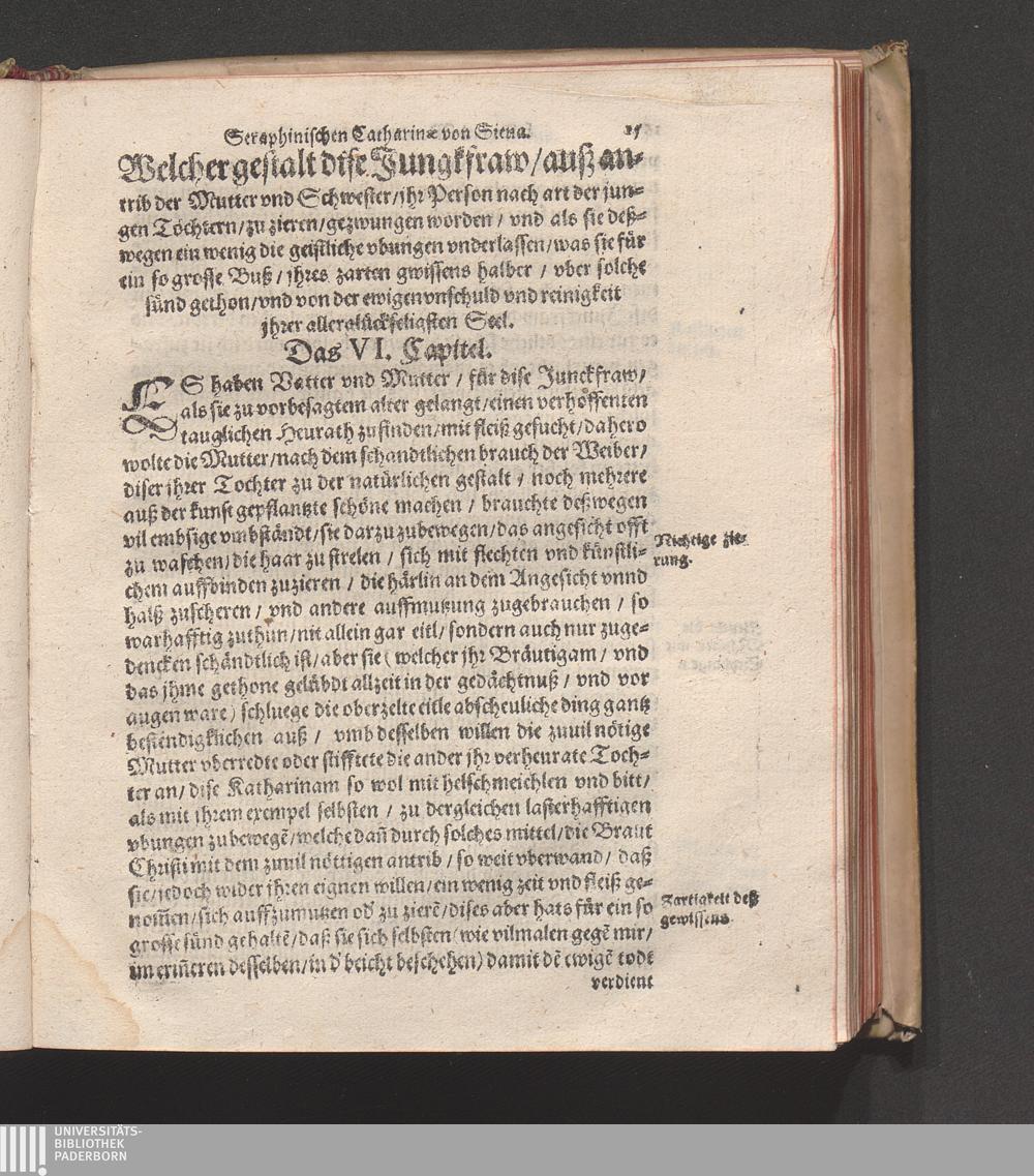 Höchst Wunderbarliches Leben/ vnd allerseligstes absterben/ sowol grosse Wunderwerck/ als auch gar herrliche/ fürtreffliche/ allerChristlichste/ von Him[m]el gefloßne Lehr/ der heiligen/ sonderbaren/ ausserwöhlten/ geliebten/ Seraphinischen vermählten Braut Jesv Christi/ Katharinæ von Siena/ der dritten Regel deß heiligen Dominici / Anfangs durch ihren Beichtvatter Beatum Raymundum, de Capua, gewesten Generalem Sacri Ordinis Prædicatorum, (deß auch die andere hieneben stehendte Authores bestettigt) inn Latein beschriben/ vnd durch F. Ambrosium Catharinum in die Welsch: An ietzo aber durch Hanßen Gaßner/ trewlich inn vnser Teutsche Sprach gebracht vnd verfertigt