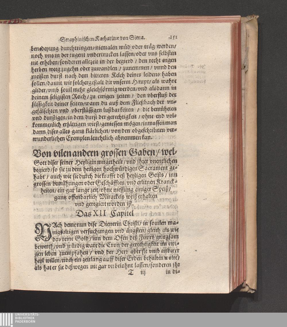 Höchst Wunderbarliches Leben/ vnd allerseligstes absterben/ sowol grosse Wunderwerck/ als auch gar herrliche/ fürtreffliche/ allerChristlichste/ von Him[m]el gefloßne Lehr/ der heiligen/ sonderbaren/ ausserwöhlten/ geliebten/ Seraphinischen vermählten Braut Jesv Christi/ Katharinæ von Siena/ der dritten Regel deß heiligen Dominici / Anfangs durch ihren Beichtvatter Beatum Raymundum, de Capua, gewesten Generalem Sacri Ordinis Prædicatorum, (deß auch die andere hieneben stehendte Authores bestettigt) inn Latein beschriben/ vnd durch F. Ambrosium Catharinum in die Welsch: An ietzo aber durch Hanßen Gaßner/ trewlich inn vnser Teutsche Sprach gebracht vnd verfertigt