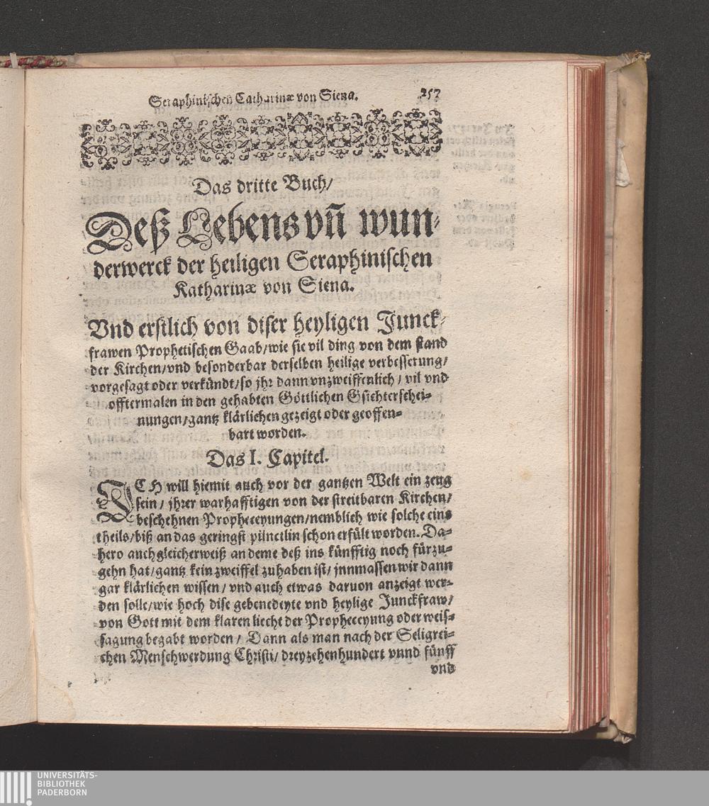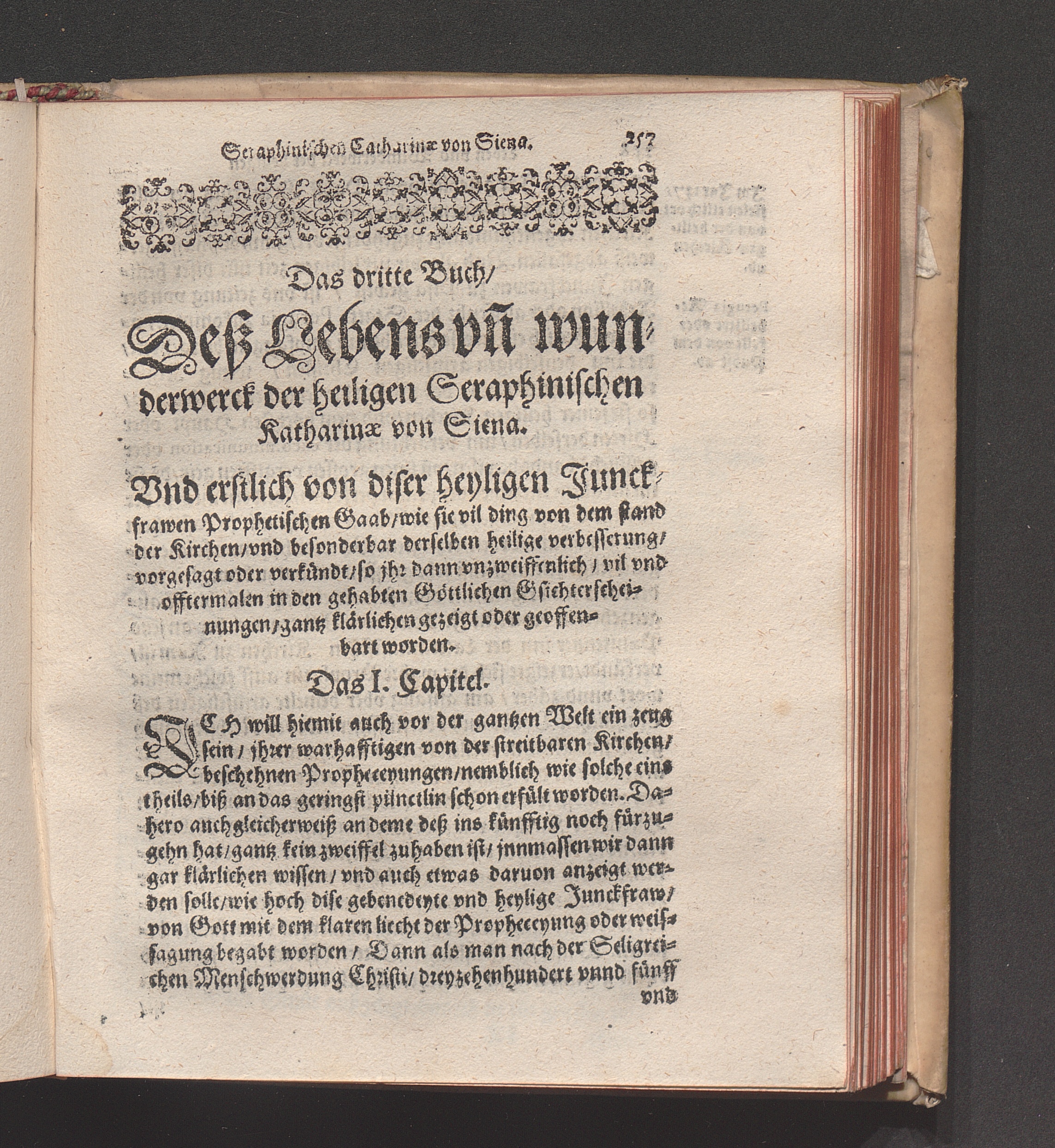 Höchst Wunderbarliches Leben/ vnd allerseligstes absterben/ sowol grosse Wunderwerck/ als auch gar herrliche/ fürtreffliche/ allerChristlichste/ von Him[m]el gefloßne Lehr/ der heiligen/ sonderbaren/ ausserwöhlten/ geliebten/ Seraphinischen vermählten Braut Jesv Christi/ Katharinæ von Siena/ der dritten Regel deß heiligen Dominici / Anfangs durch ihren Beichtvatter Beatum Raymundum, de Capua, gewesten Generalem Sacri Ordinis Prædicatorum, (deß auch die andere hieneben stehendte Authores bestettigt) inn Latein beschriben/ vnd durch F. Ambrosium Catharinum in die Welsch: An ietzo aber durch Hanßen Gaßner/ trewlich inn vnser Teutsche Sprach gebracht vnd verfertigt