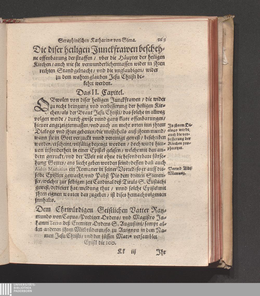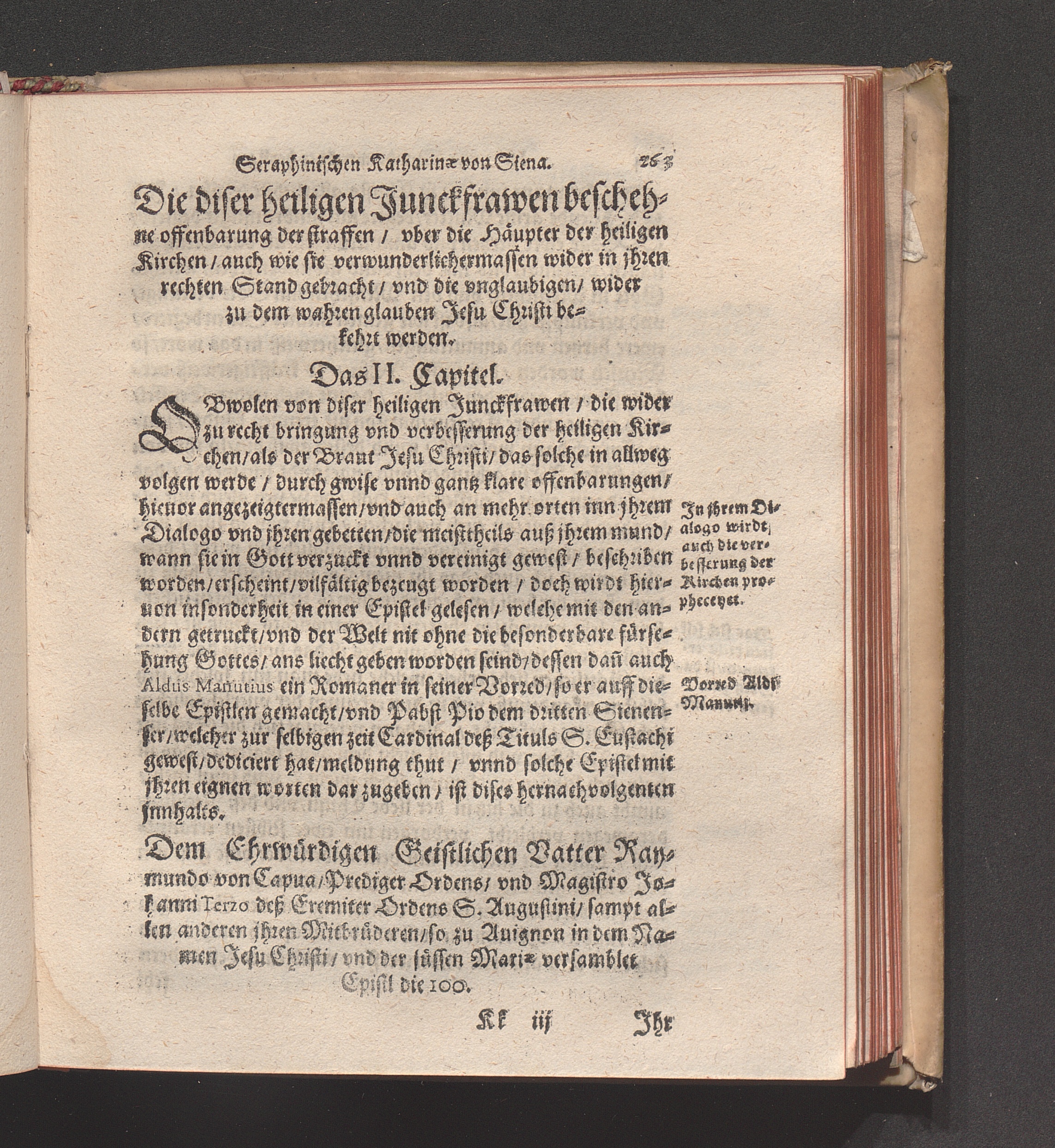 Höchst Wunderbarliches Leben/ vnd allerseligstes absterben/ sowol grosse Wunderwerck/ als auch gar herrliche/ fürtreffliche/ allerChristlichste/ von Him[m]el gefloßne Lehr/ der heiligen/ sonderbaren/ ausserwöhlten/ geliebten/ Seraphinischen vermählten Braut Jesv Christi/ Katharinæ von Siena/ der dritten Regel deß heiligen Dominici / Anfangs durch ihren Beichtvatter Beatum Raymundum, de Capua, gewesten Generalem Sacri Ordinis Prædicatorum, (deß auch die andere hieneben stehendte Authores bestettigt) inn Latein beschriben/ vnd durch F. Ambrosium Catharinum in die Welsch: An ietzo aber durch Hanßen Gaßner/ trewlich inn vnser Teutsche Sprach gebracht vnd verfertigt