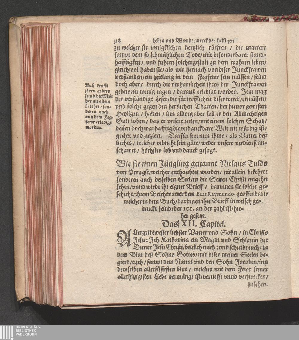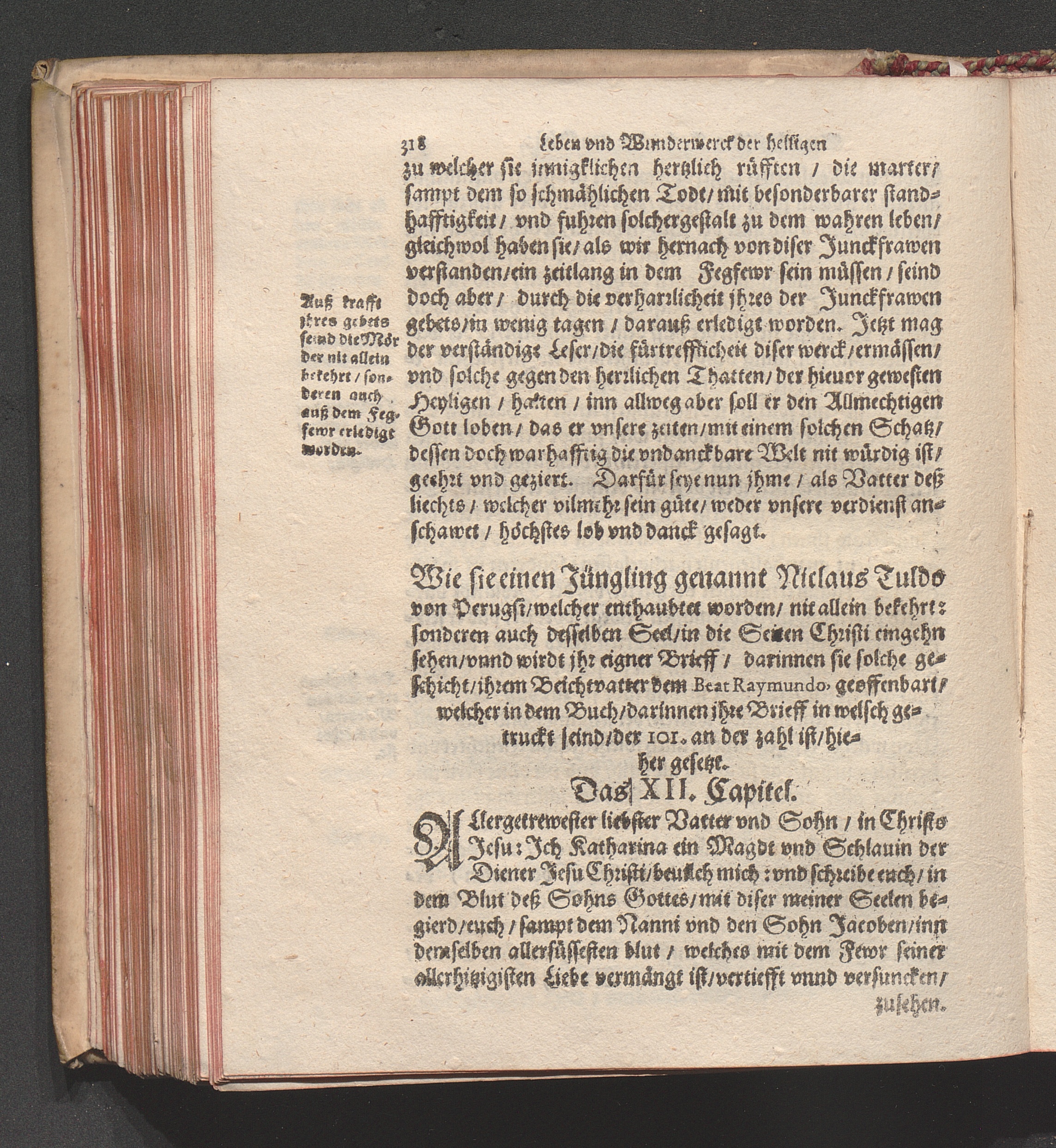 Höchst Wunderbarliches Leben/ vnd allerseligstes absterben/ sowol grosse Wunderwerck/ als auch gar herrliche/ fürtreffliche/ allerChristlichste/ von Him[m]el gefloßne Lehr/ der heiligen/ sonderbaren/ ausserwöhlten/ geliebten/ Seraphinischen vermählten Braut Jesv Christi/ Katharinæ von Siena/ der dritten Regel deß heiligen Dominici / Anfangs durch ihren Beichtvatter Beatum Raymundum, de Capua, gewesten Generalem Sacri Ordinis Prædicatorum, (deß auch die andere hieneben stehendte Authores bestettigt) inn Latein beschriben/ vnd durch F. Ambrosium Catharinum in die Welsch: An ietzo aber durch Hanßen Gaßner/ trewlich inn vnser Teutsche Sprach gebracht vnd verfertigt