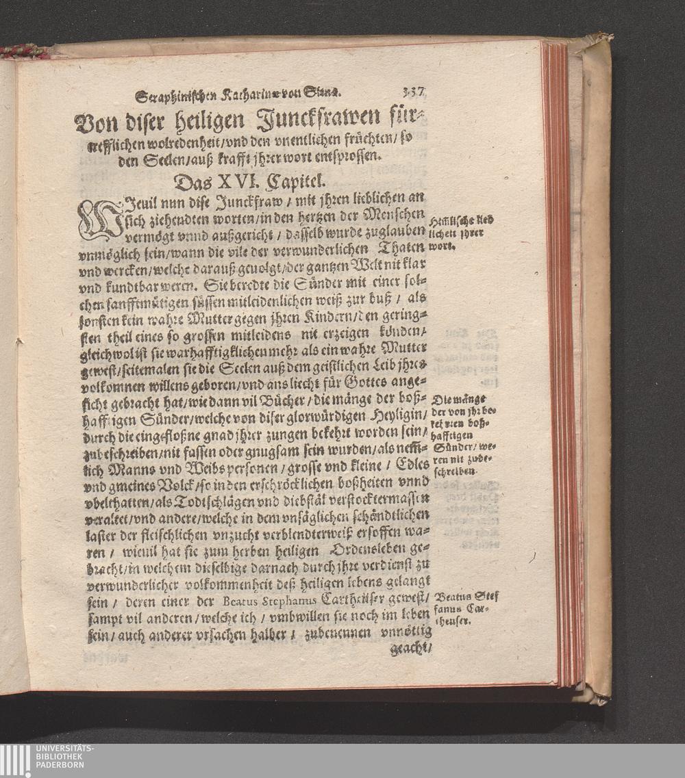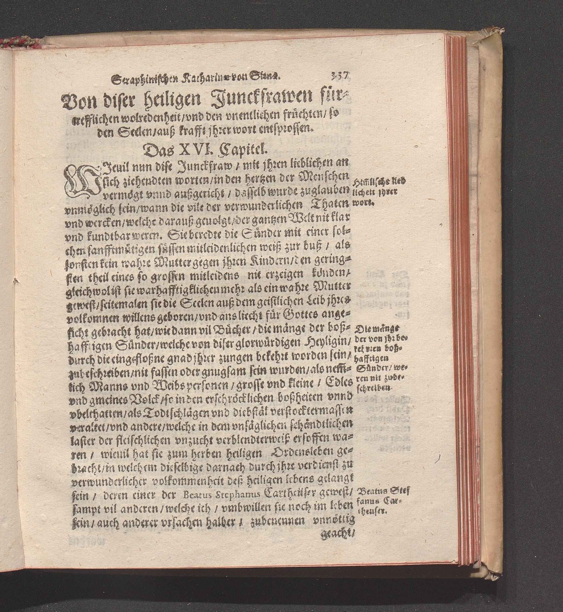 Höchst Wunderbarliches Leben/ vnd allerseligstes absterben/ sowol grosse Wunderwerck/ als auch gar herrliche/ fürtreffliche/ allerChristlichste/ von Him[m]el gefloßne Lehr/ der heiligen/ sonderbaren/ ausserwöhlten/ geliebten/ Seraphinischen vermählten Braut Jesv Christi/ Katharinæ von Siena/ der dritten Regel deß heiligen Dominici / Anfangs durch ihren Beichtvatter Beatum Raymundum, de Capua, gewesten Generalem Sacri Ordinis Prædicatorum, (deß auch die andere hieneben stehendte Authores bestettigt) inn Latein beschriben/ vnd durch F. Ambrosium Catharinum in die Welsch: An ietzo aber durch Hanßen Gaßner/ trewlich inn vnser Teutsche Sprach gebracht vnd verfertigt