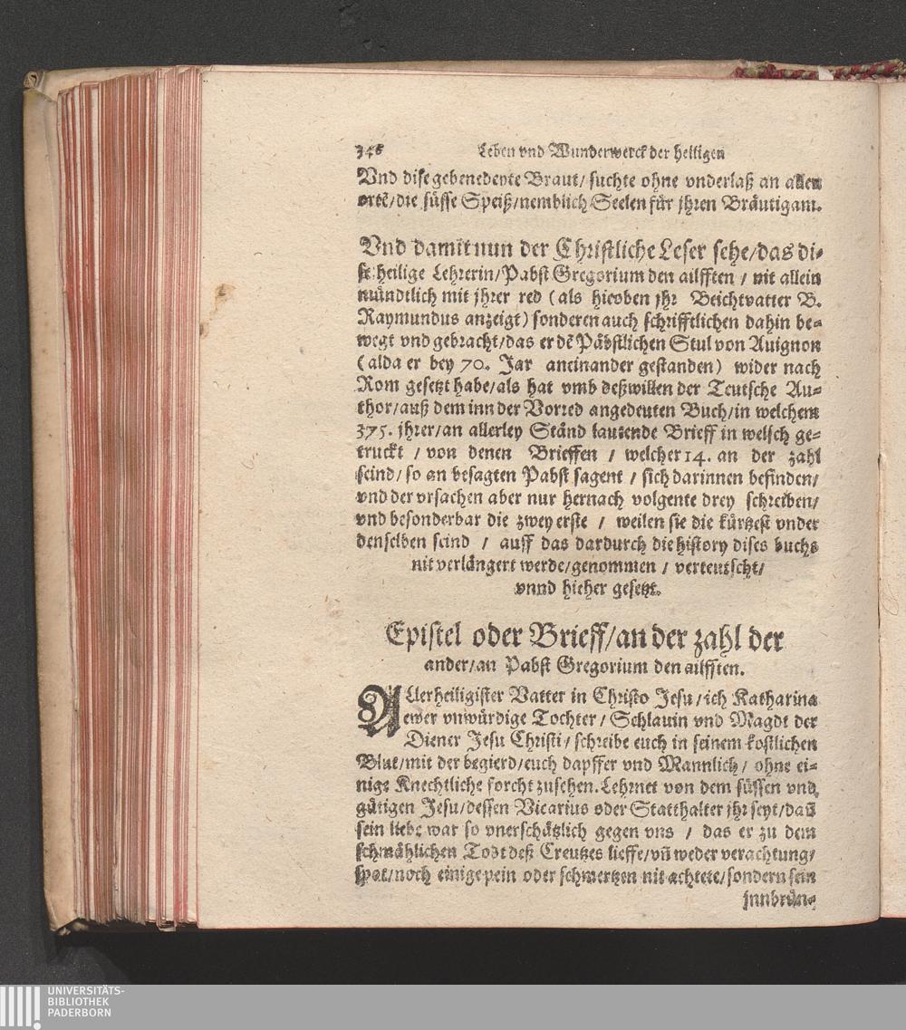Höchst Wunderbarliches Leben/ vnd allerseligstes absterben/ sowol grosse Wunderwerck/ als auch gar herrliche/ fürtreffliche/ allerChristlichste/ von Him[m]el gefloßne Lehr/ der heiligen/ sonderbaren/ ausserwöhlten/ geliebten/ Seraphinischen vermählten Braut Jesv Christi/ Katharinæ von Siena/ der dritten Regel deß heiligen Dominici / Anfangs durch ihren Beichtvatter Beatum Raymundum, de Capua, gewesten Generalem Sacri Ordinis Prædicatorum, (deß auch die andere hieneben stehendte Authores bestettigt) inn Latein beschriben/ vnd durch F. Ambrosium Catharinum in die Welsch: An ietzo aber durch Hanßen Gaßner/ trewlich inn vnser Teutsche Sprach gebracht vnd verfertigt