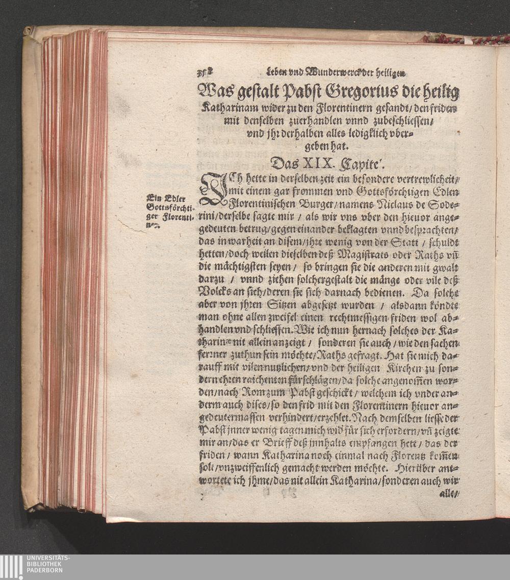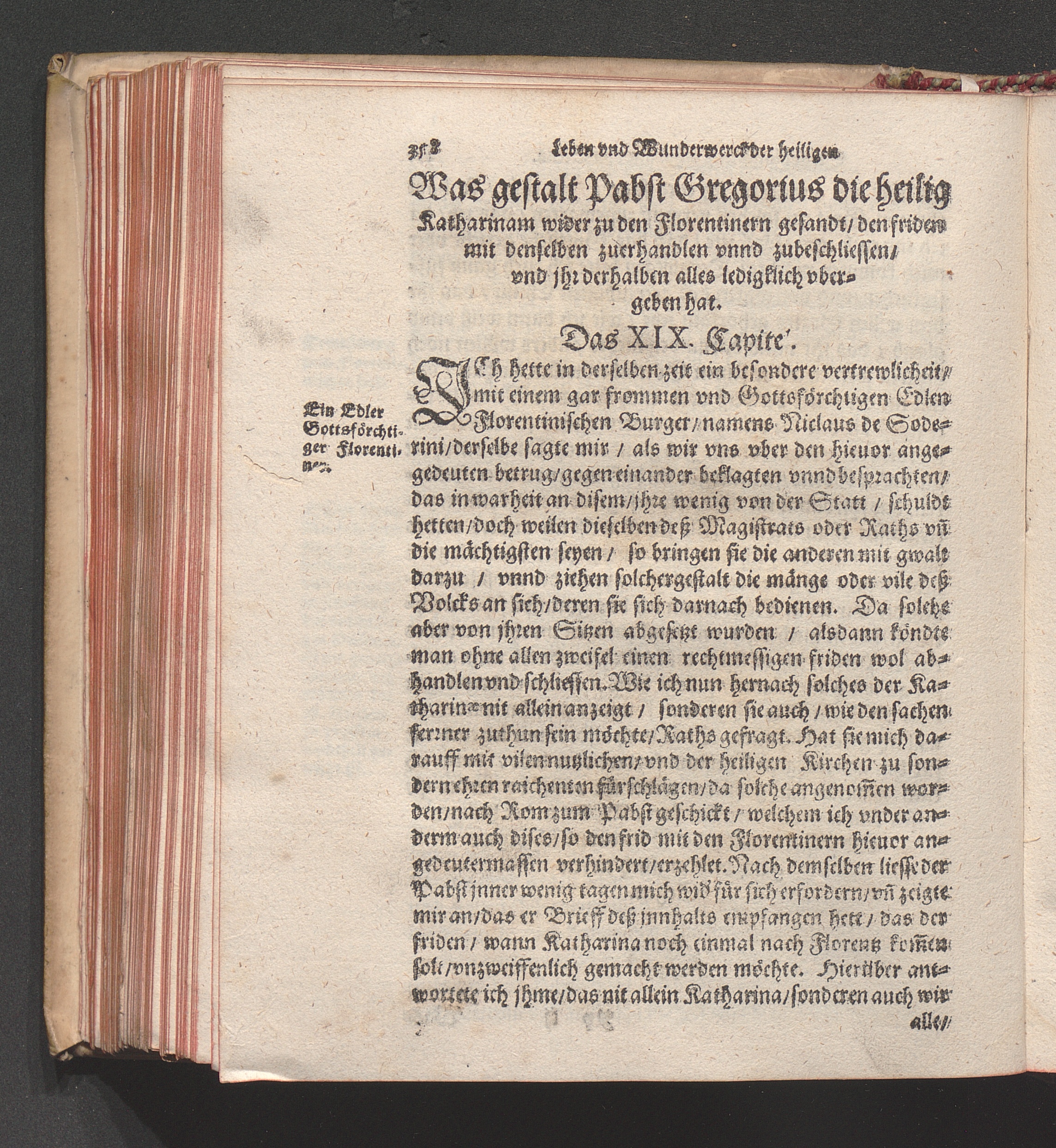 Höchst Wunderbarliches Leben/ vnd allerseligstes absterben/ sowol grosse Wunderwerck/ als auch gar herrliche/ fürtreffliche/ allerChristlichste/ von Him[m]el gefloßne Lehr/ der heiligen/ sonderbaren/ ausserwöhlten/ geliebten/ Seraphinischen vermählten Braut Jesv Christi/ Katharinæ von Siena/ der dritten Regel deß heiligen Dominici / Anfangs durch ihren Beichtvatter Beatum Raymundum, de Capua, gewesten Generalem Sacri Ordinis Prædicatorum, (deß auch die andere hieneben stehendte Authores bestettigt) inn Latein beschriben/ vnd durch F. Ambrosium Catharinum in die Welsch: An ietzo aber durch Hanßen Gaßner/ trewlich inn vnser Teutsche Sprach gebracht vnd verfertigt