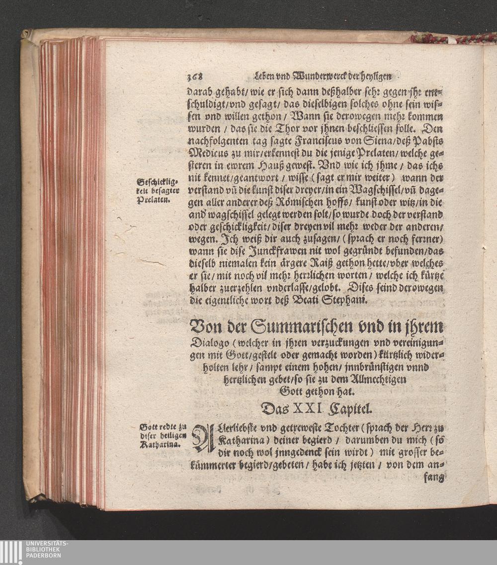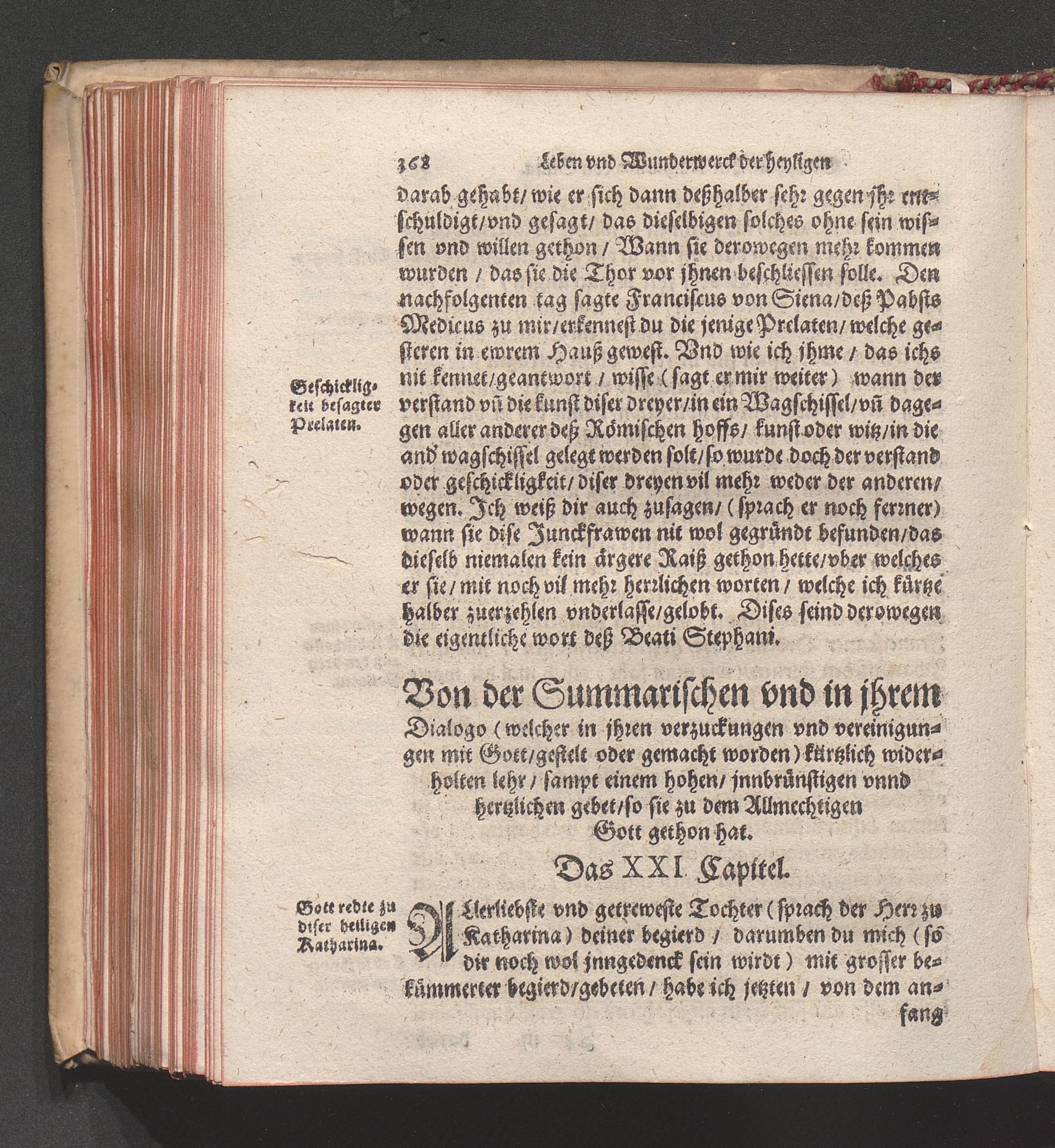 Höchst Wunderbarliches Leben/ vnd allerseligstes absterben/ sowol grosse Wunderwerck/ als auch gar herrliche/ fürtreffliche/ allerChristlichste/ von Him[m]el gefloßne Lehr/ der heiligen/ sonderbaren/ ausserwöhlten/ geliebten/ Seraphinischen vermählten Braut Jesv Christi/ Katharinæ von Siena/ der dritten Regel deß heiligen Dominici / Anfangs durch ihren Beichtvatter Beatum Raymundum, de Capua, gewesten Generalem Sacri Ordinis Prædicatorum, (deß auch die andere hieneben stehendte Authores bestettigt) inn Latein beschriben/ vnd durch F. Ambrosium Catharinum in die Welsch: An ietzo aber durch Hanßen Gaßner/ trewlich inn vnser Teutsche Sprach gebracht vnd verfertigt
