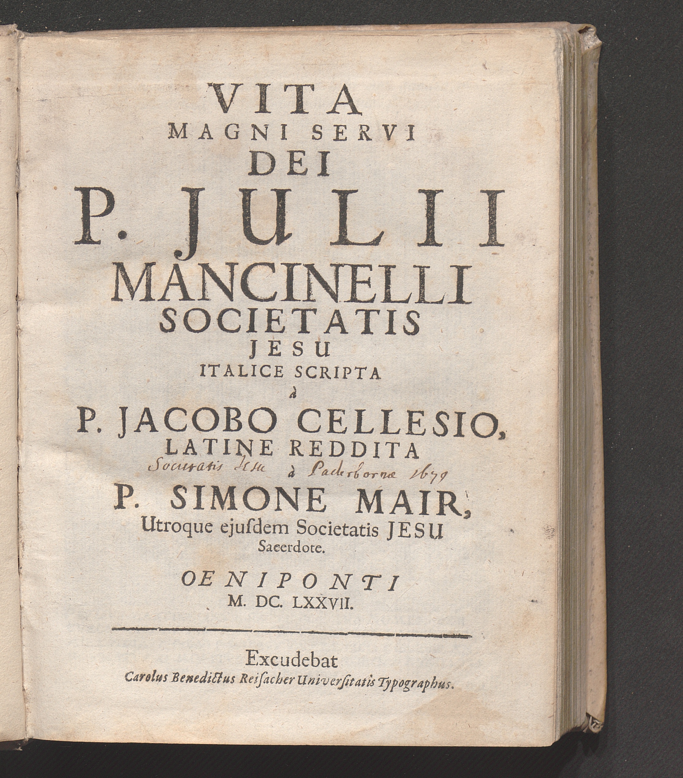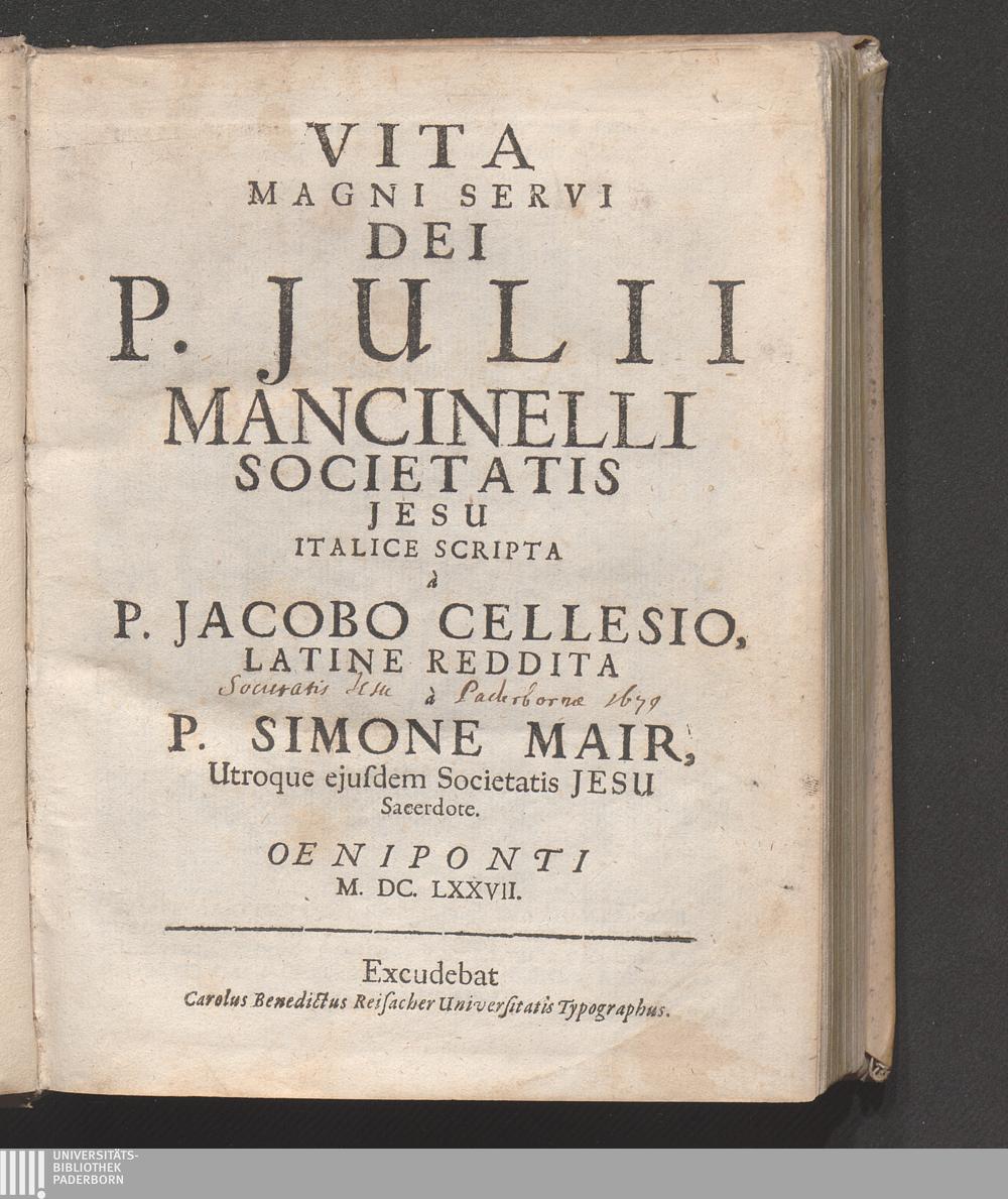Vita Magni Servi Dei P. Julii Mancinelli Societatis Jesu / Italice Scripta à P. Jacobo Cellesio, Latine Reddita à P. Simone Mair, Utroque ejusdem Societatis Jesu Sacerdote