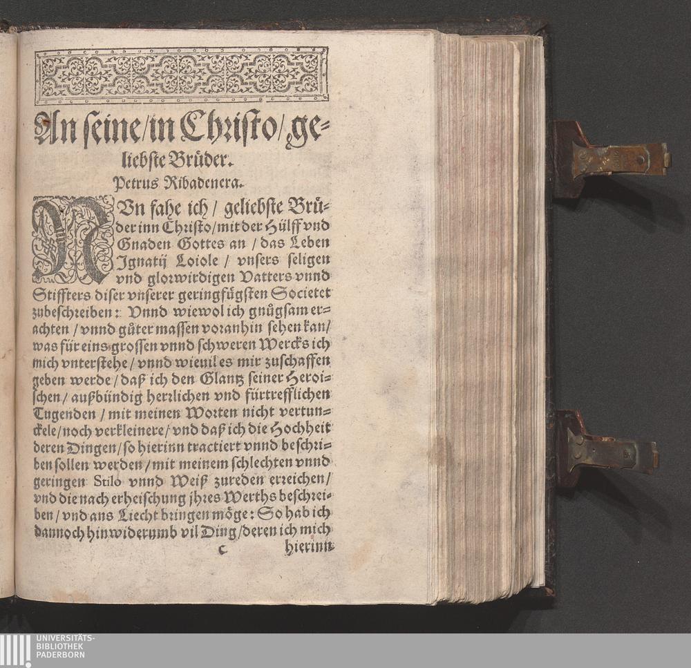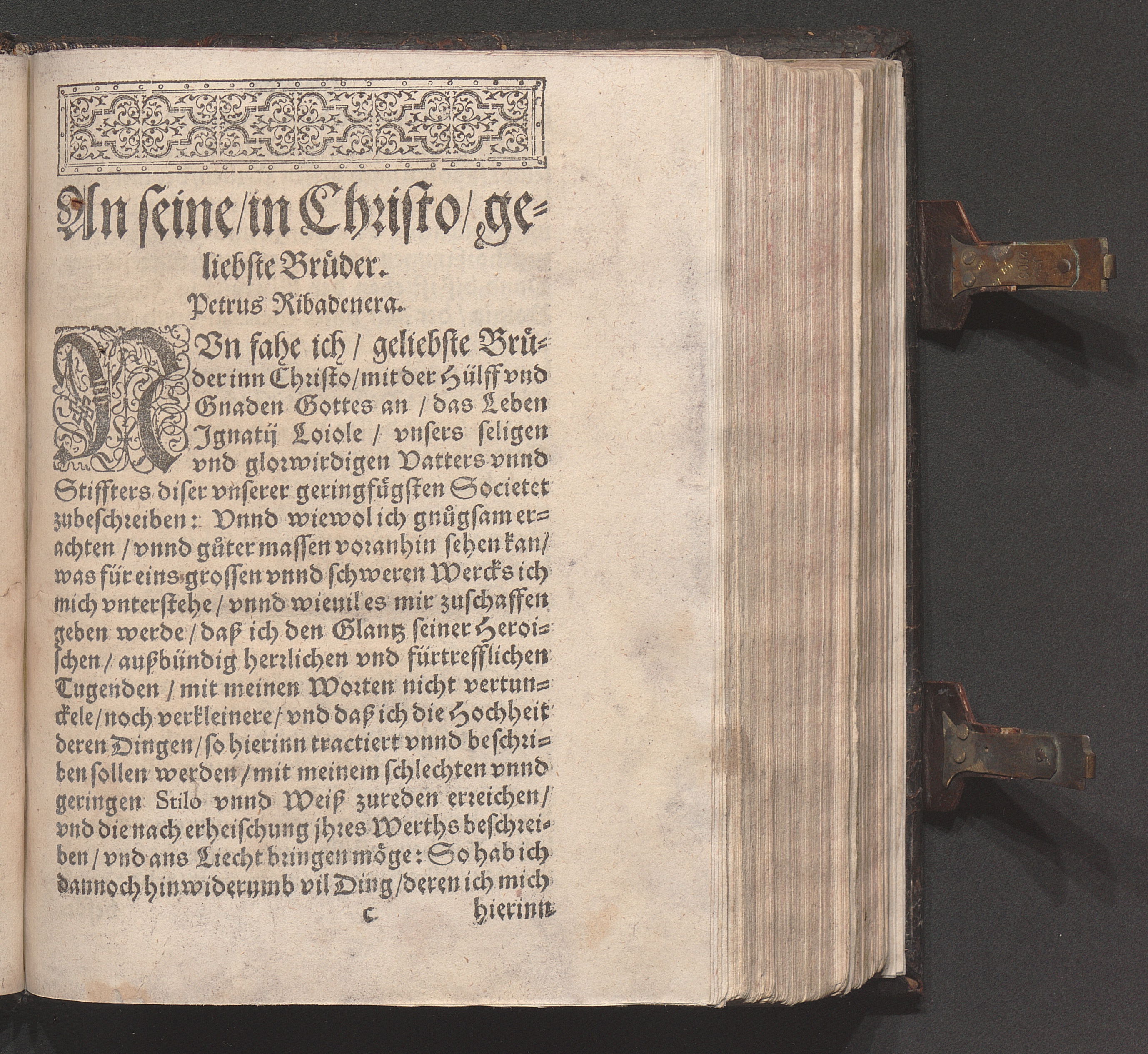 Historia Von dem Leben und Wandel Jgnatij Loiole/ Anfengers vnd Stiffters der Religion/ die Societet Iesv genannt / Erstlich von Petro Ribadenera in Spanischer Sprach beschriben/ Nachmals durch Johannem Jolitum inn die Welsche/ vnd ferner in vnser hochteutsche Sprach versetzet