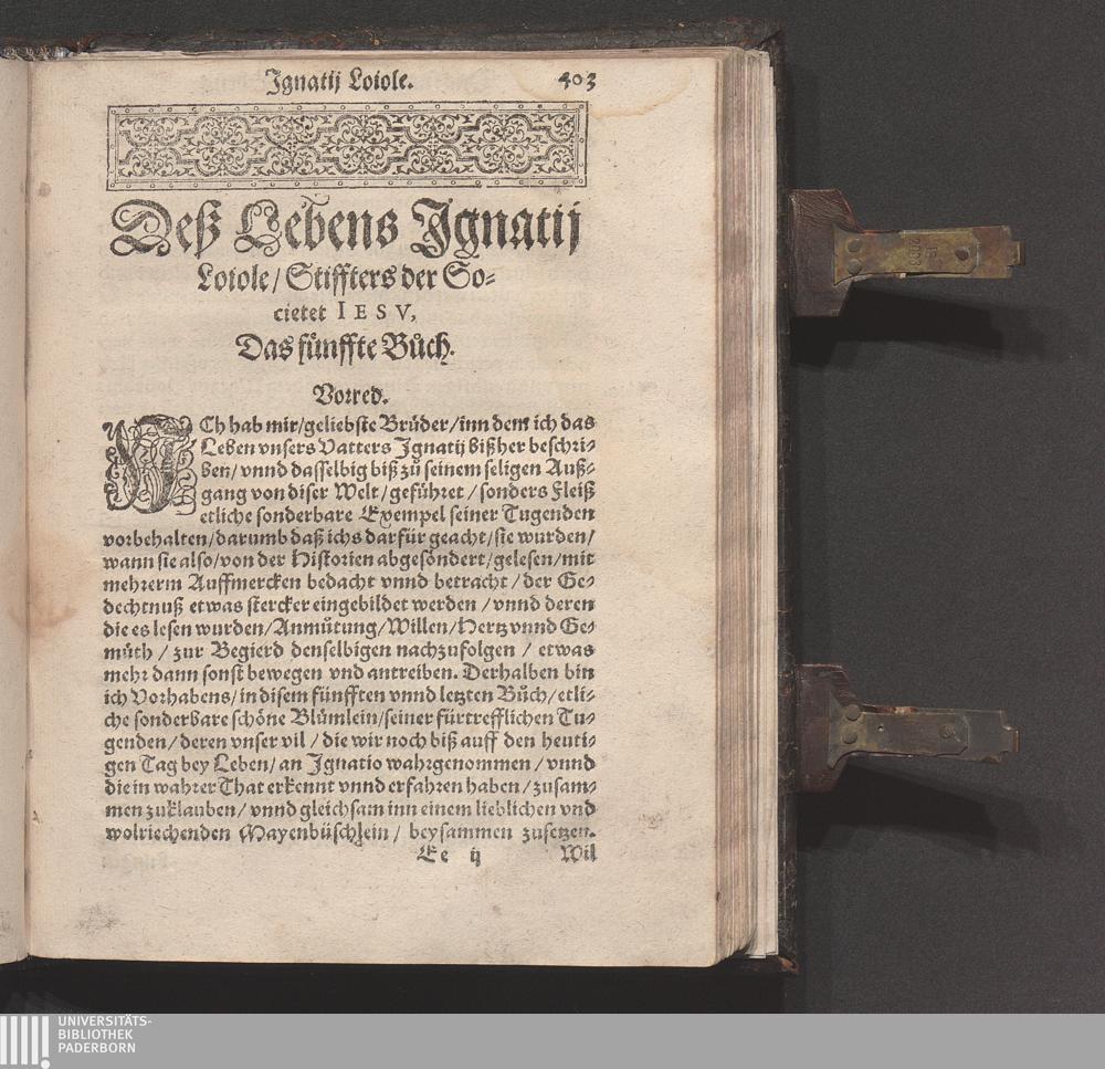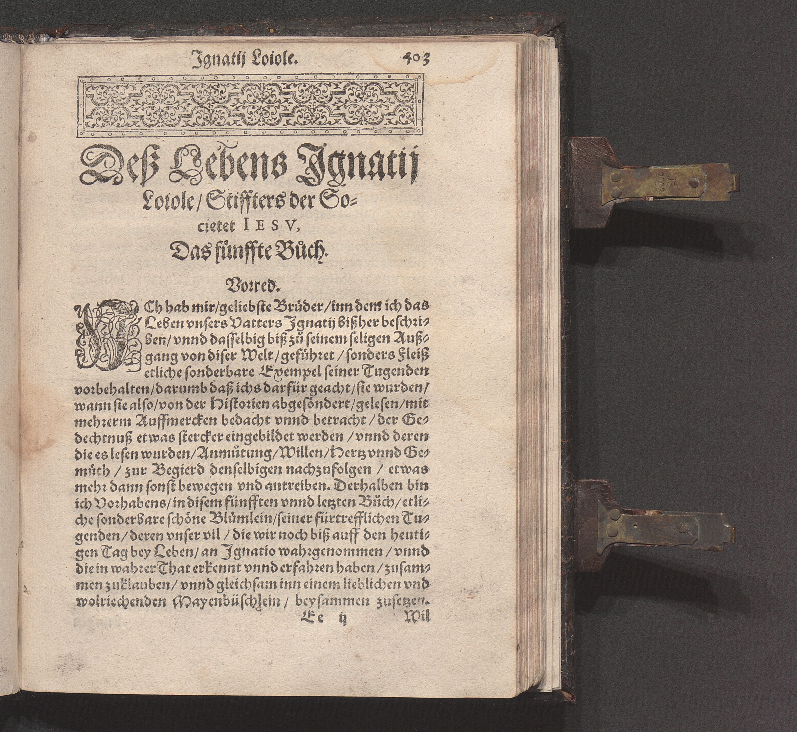 Historia Von dem Leben und Wandel Jgnatij Loiole/ Anfengers vnd Stiffters der Religion/ die Societet Iesv genannt / Erstlich von Petro Ribadenera in Spanischer Sprach beschriben/ Nachmals durch Johannem Jolitum inn die Welsche/ vnd ferner in vnser hochteutsche Sprach versetzet