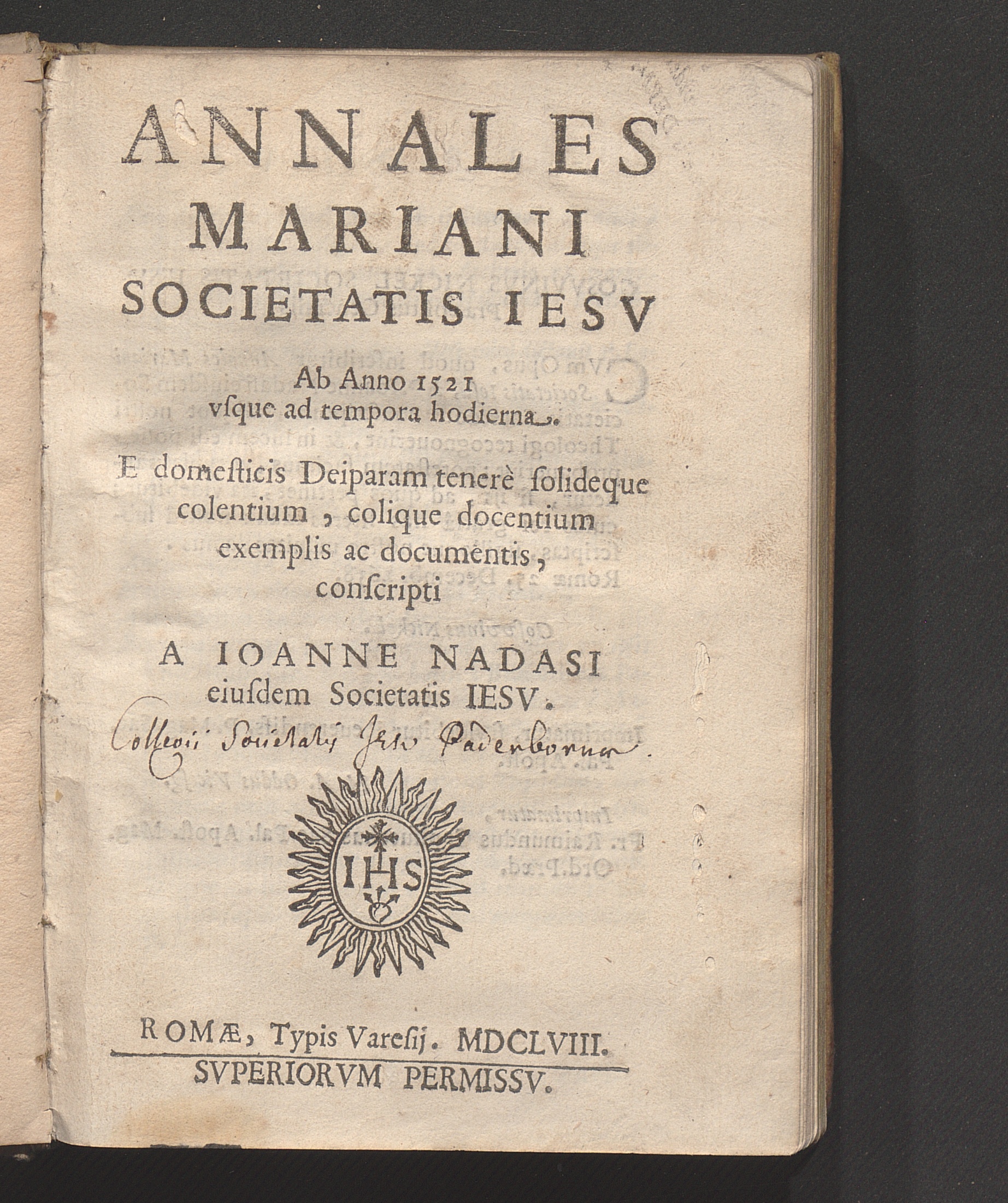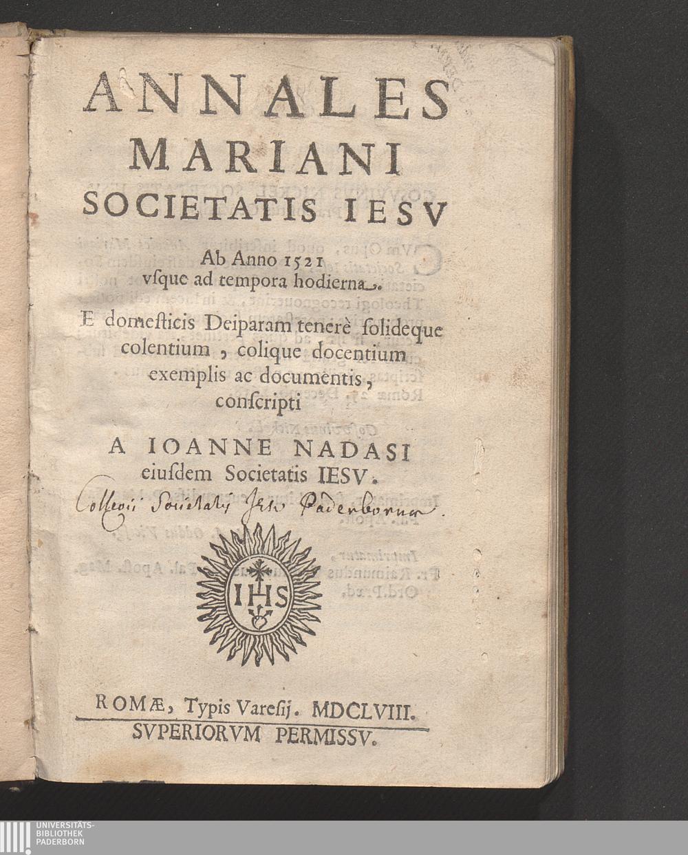 Annales Mariani Societatis Iesv : Ab Anno 1521 vsque ad tempora hodierna. E domesticis Deiparam tenerè solideque colentium, colique docentium exemplis ac documentis, conscripti / A Ioanne Nadasi eiusdem Societatis Iesv