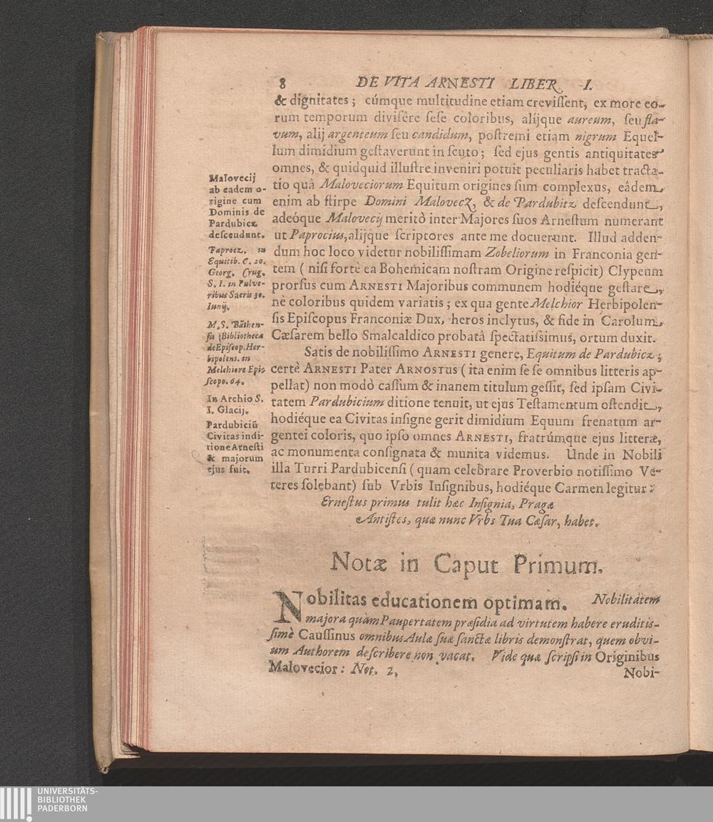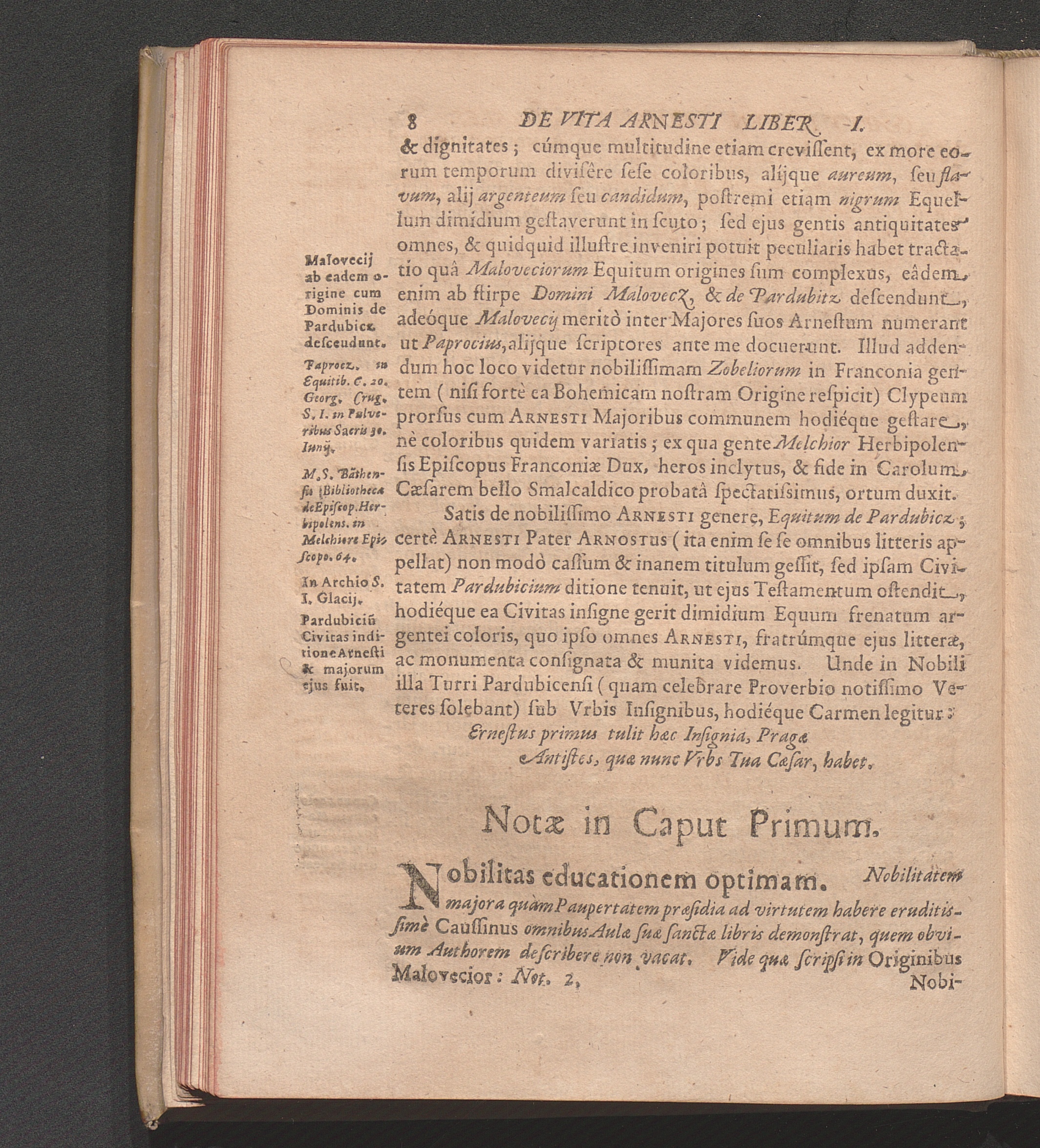 Vita Venerabilis Arnesti, (vulgò Ernesti) Primi Archiepiscopi Pragensis : Nobilitate Sanguinis, Sapientiâ ac Litteris, Morum innocentiâ & Sanctimoniâ, rebus maximis gestis, ac denique Virtutibus omnibus Antistitis Clarissimi; Ex ijs Quæ de eo Vitæ Scriptor coævus collegit, aliísq[ue] vetustissimis, ac fide dignis monimentis ; Additæ sunt accuratissimæ Notæ, quibus eorum temporum, totiúsq[ue] Regni Bohemiæ historia multùm illustratur / Authore Bohuslao Aloysio Balbino, Soc. Jesv Sacerdote