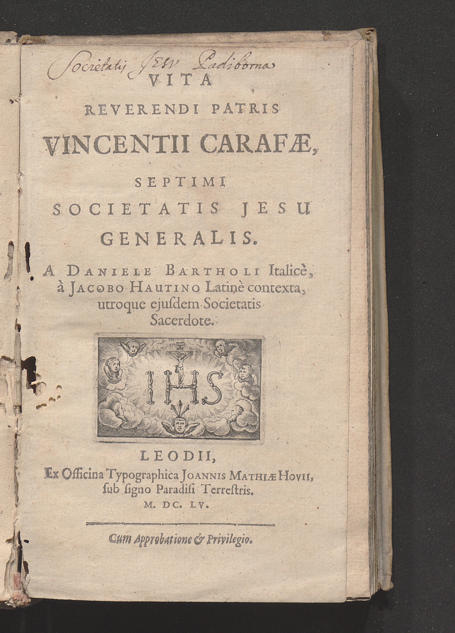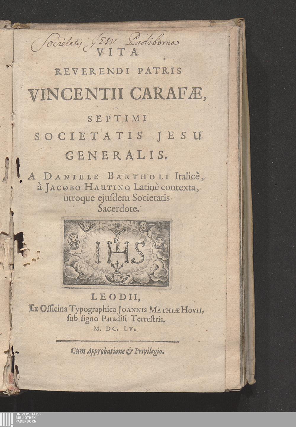 Vita Reverendi Patris Vincentii Carafæ, Septimi Societatis Jesu Generalis / A Daniele Bartholi Italicè, à Jacobo Hautino Latinè contexta, utroque ejusdem Societatis Sacerdote