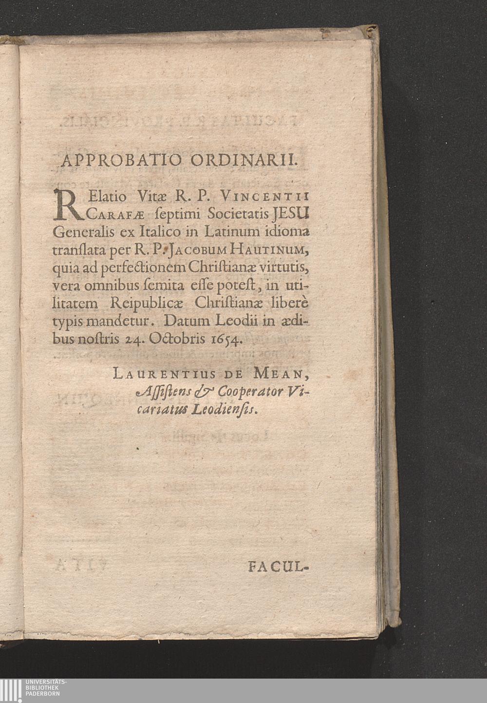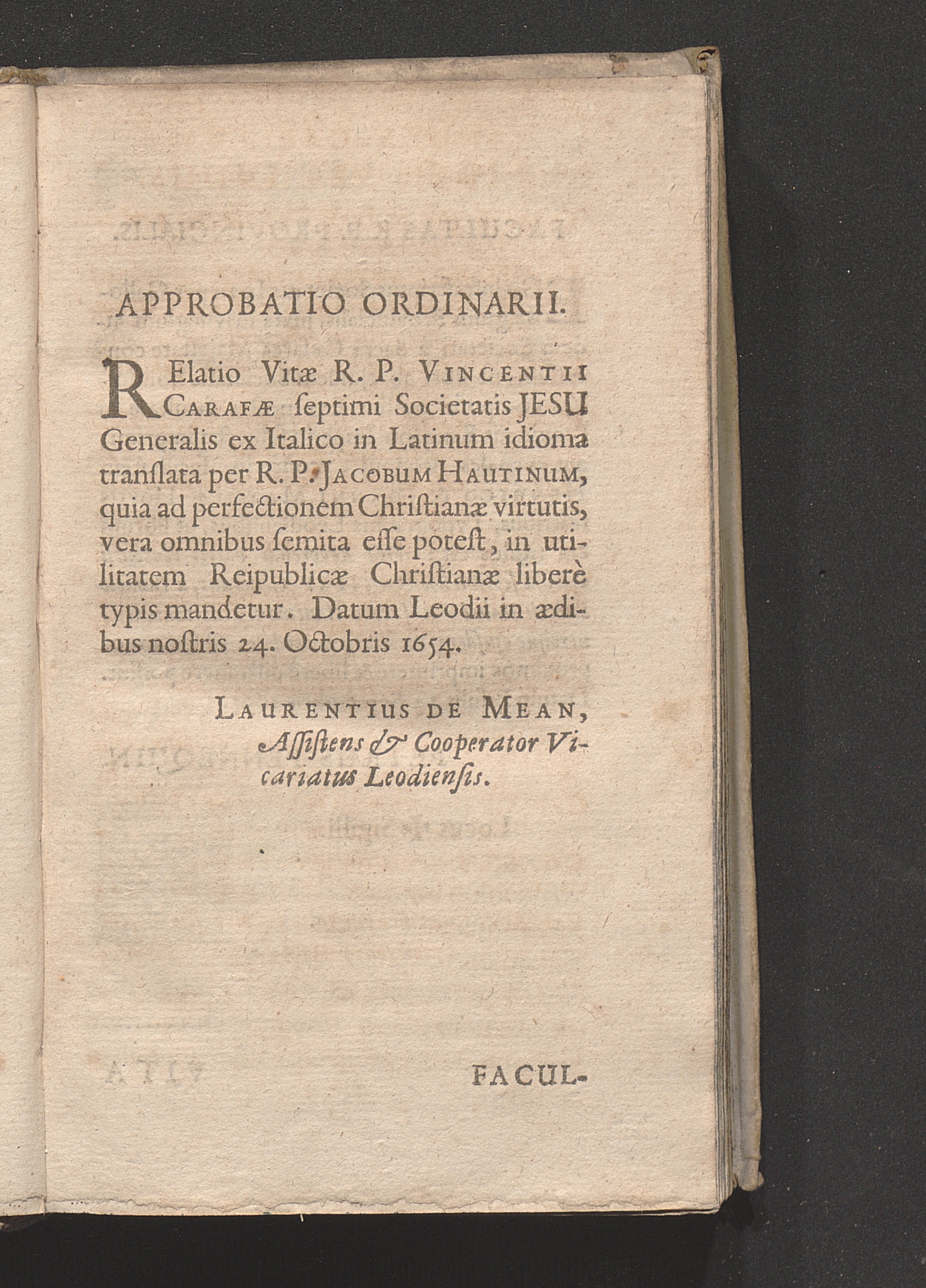 Vita Reverendi Patris Vincentii Carafæ, Septimi Societatis Jesu Generalis / A Daniele Bartholi Italicè, à Jacobo Hautino Latinè contexta, utroque ejusdem Societatis Sacerdote
