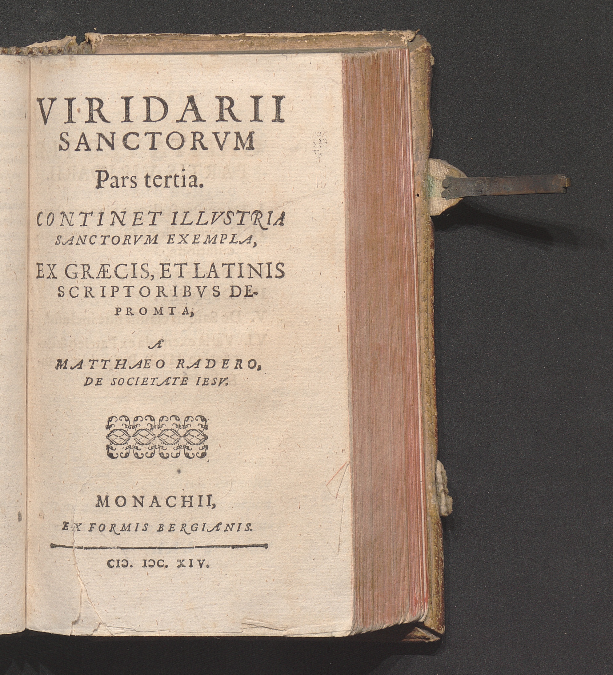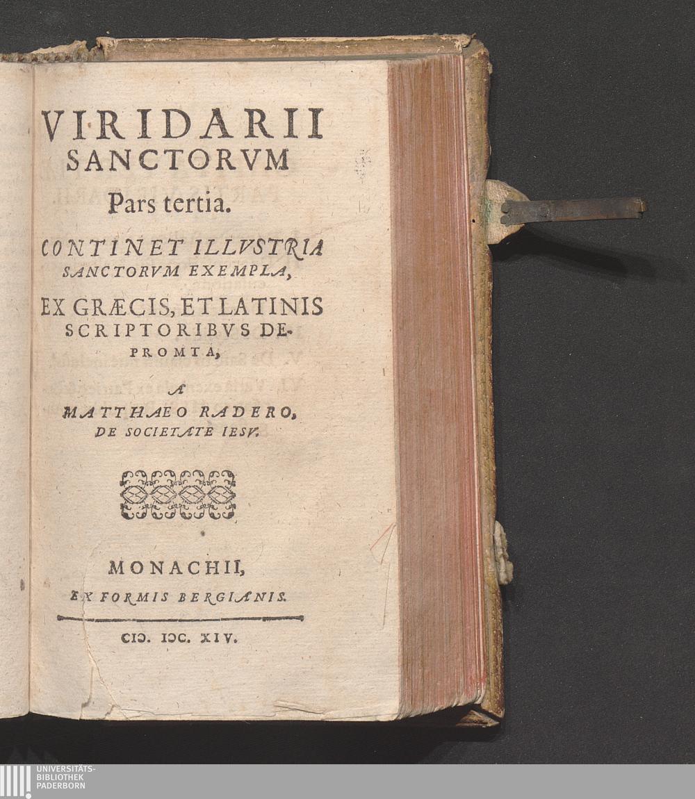 Opvscvla Sacra Matthaei Raderi E Societ: Iesv : Viridarii Sanctorvm Partes Tres; Avla Sancta; S. Ioann: Climaci Liber Ad Pastorem; Syntagma De Statv Morientivm, Cvm Dvabvs Odis; Recognita paßimq[ue] aucta