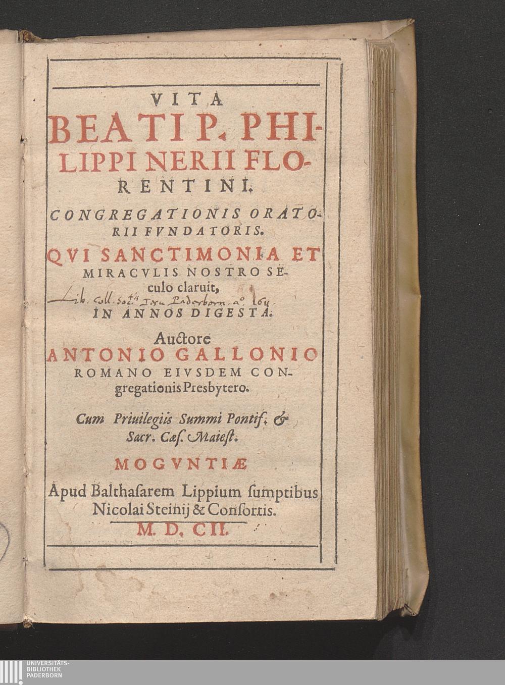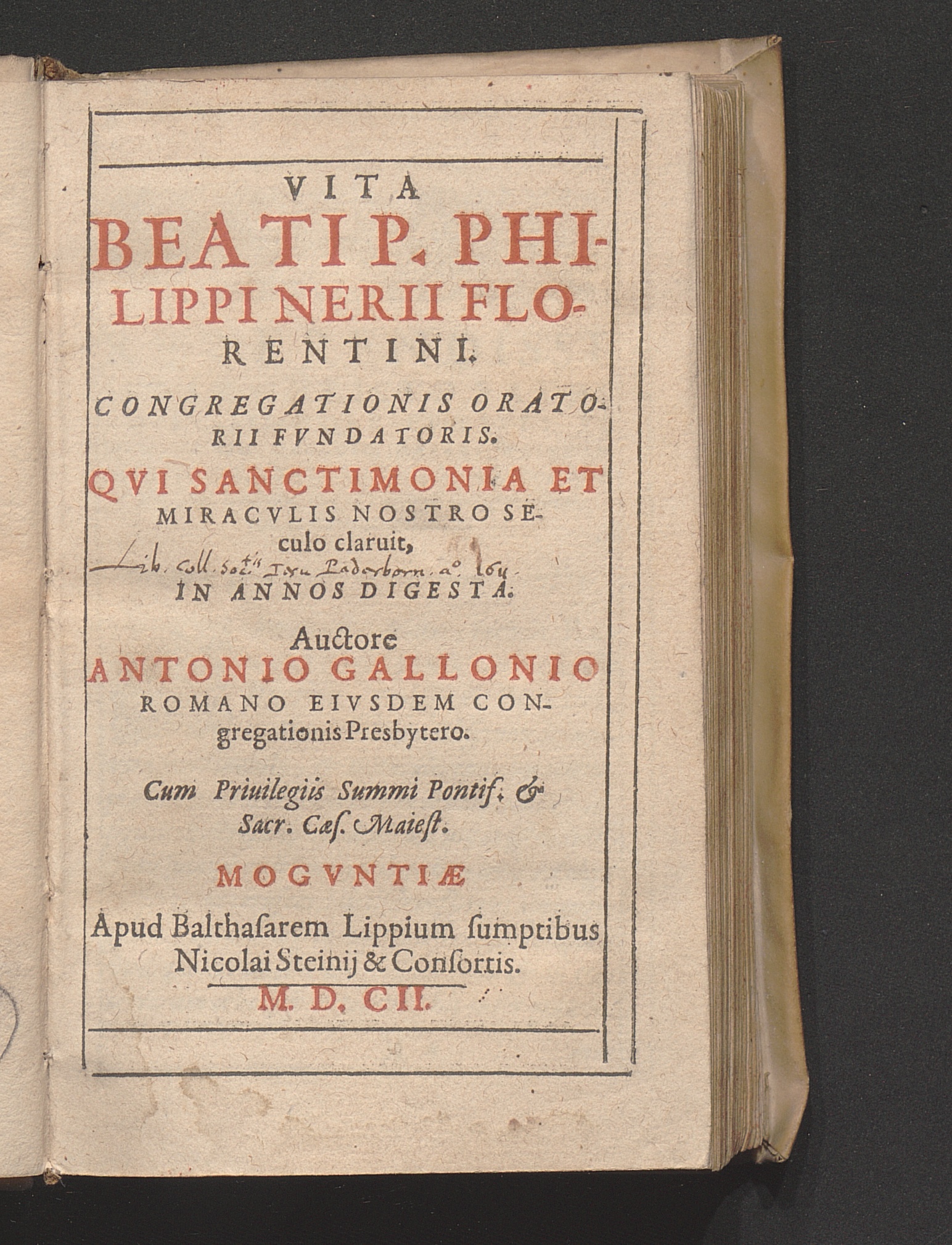 Vita Beati P. Philippi Nerii Florentini. Congregationis Oratorii Fvndatoris : Qvi Sanctimonia Et Miracvlis Nostro Seculo claruit, In Annos Digesta / Auctore Antonio Gallonio Romano Eivsdem Congregationis Presbytero
