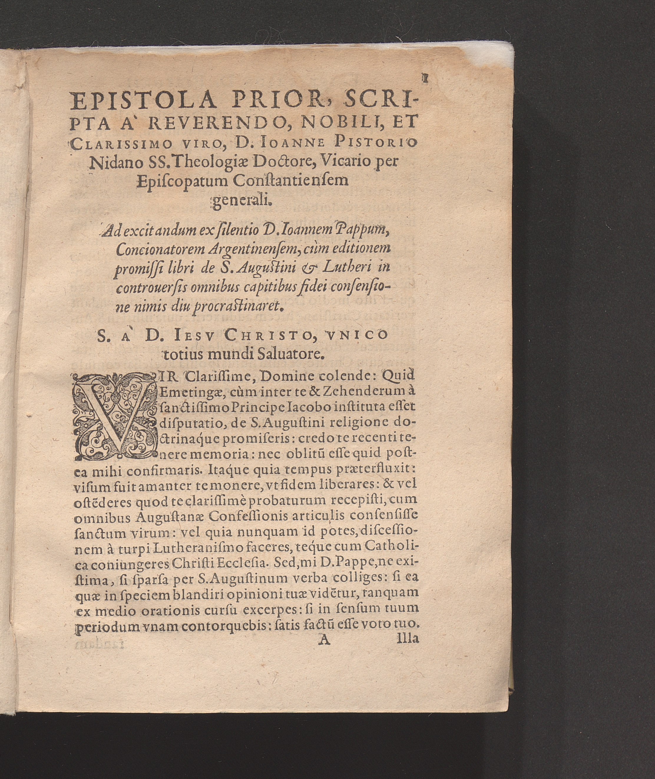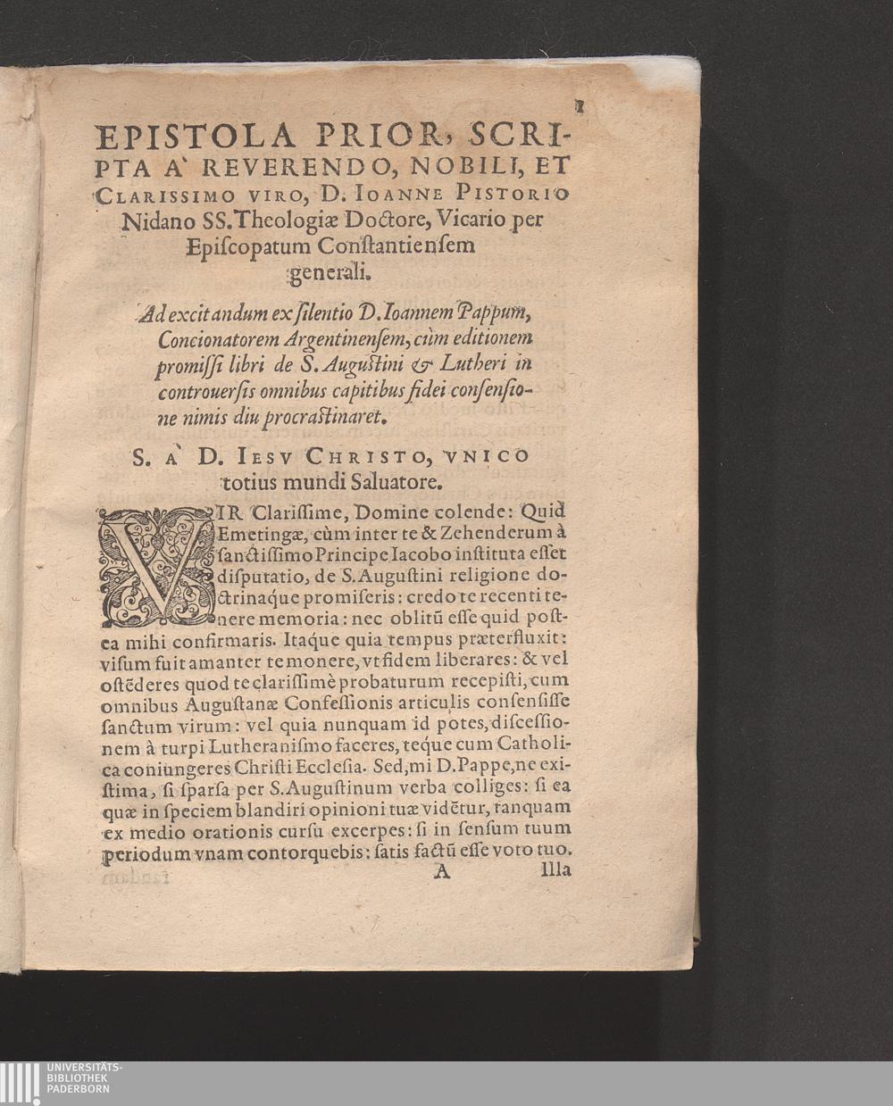 Epistolae Tres Ad || D. Ioannem Pappvm || Theologvm Lvthe-||ranvm:|| Prima, Excitatoria, cùm in seruando iureiurando Emetingæ facto, ne-||gligentior esset Pappus.|| Secunda, Refutatoria Parallelorum Pappi ... || Tertia, quæ iam primùm in lucem refertur, & tanquam integer liber || est, Demonstratoria, nullum omnium mortalium ... || sensisse de fide Christi vt sensit Lutherus & credidisse || vt ille credidit.|| / Avthore || ... D. Ioanne Pistorio Nidano, SS. Theolo-||giae Doctore, Protonotario Apostolico, Ca-||nonico Constantiensi, Sereniss. Avstriæ || Et Bavariæ PPP. Con-||siliario.||