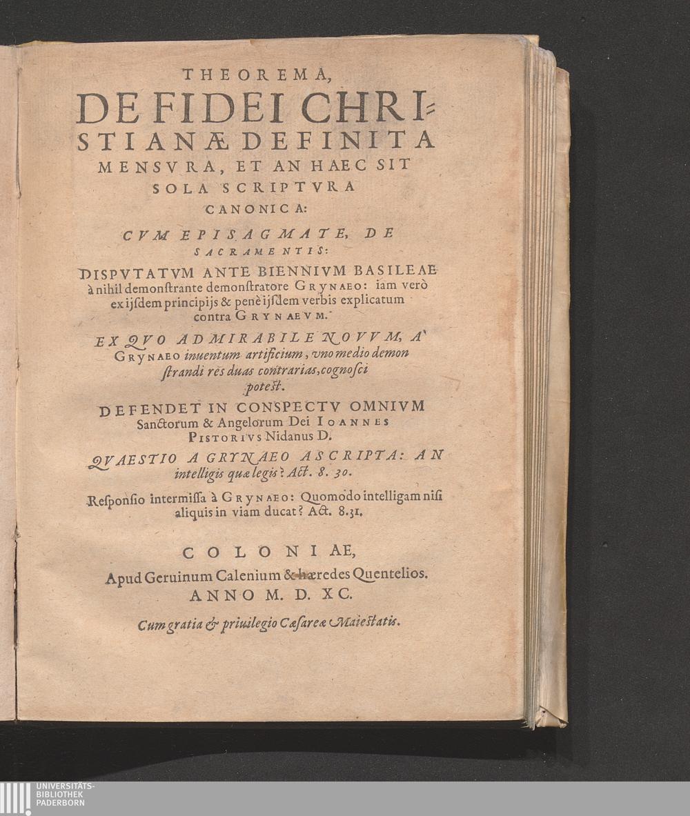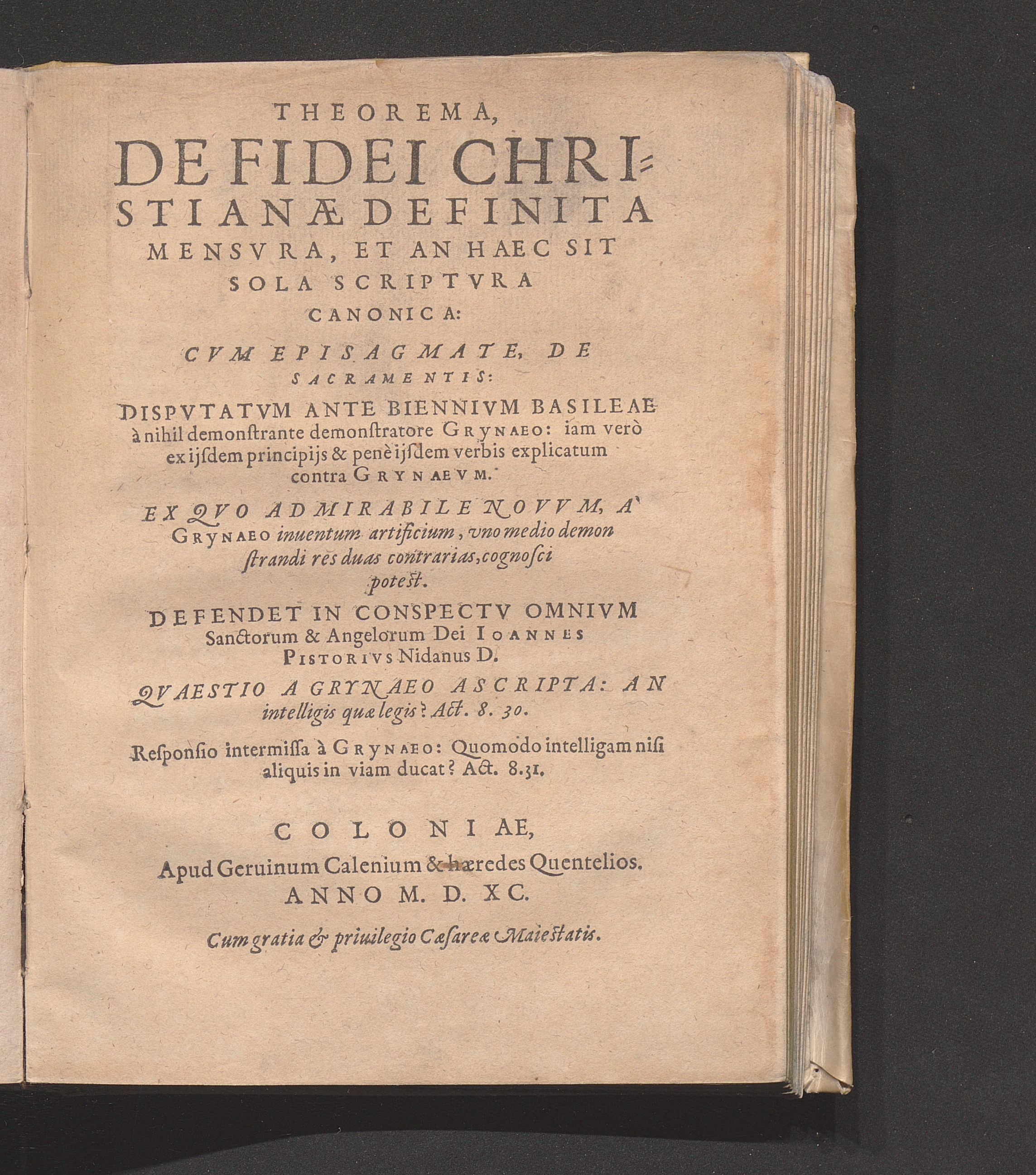 Theorema, De Fidei Christianæ Definita Mensvra, Et An Haec Sit Sola Scriptvra Canonica : Cvm Episagmate, De Sacramentis: Dispvtatvm Ante Biennivm Basileae à nihil demonstrante demonstratore Grynaeo: iam verò ex ijsdem principijs & penè ijsdem verbis explicatum contra Grynaevm ... / Defendet In Conspectv Omnivm Sanctorum & Angelorum Dei Ioannes Pistorivs Nidanus D.