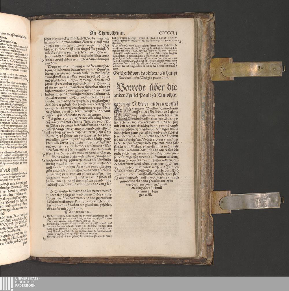 Biblia/ beider|| Allt vnnd Newen Testa||menten/ : fleissig/ treülich vn[d] Christ||lich/ nach alter/ inn Christlicher|| kirchen gehabter Translation/ mit auß=||legunng etlicher dunckeler ort/ vnnd besse=||rung viler verrückter wort vnd sprüch/|| so biß anhere inn andernn kurtz auß=||gangnen theutschen Bibeln ge=||spürt vnd gesehen|| / Durch D. Johan Dieten||berger/ new verdeutscht ...||