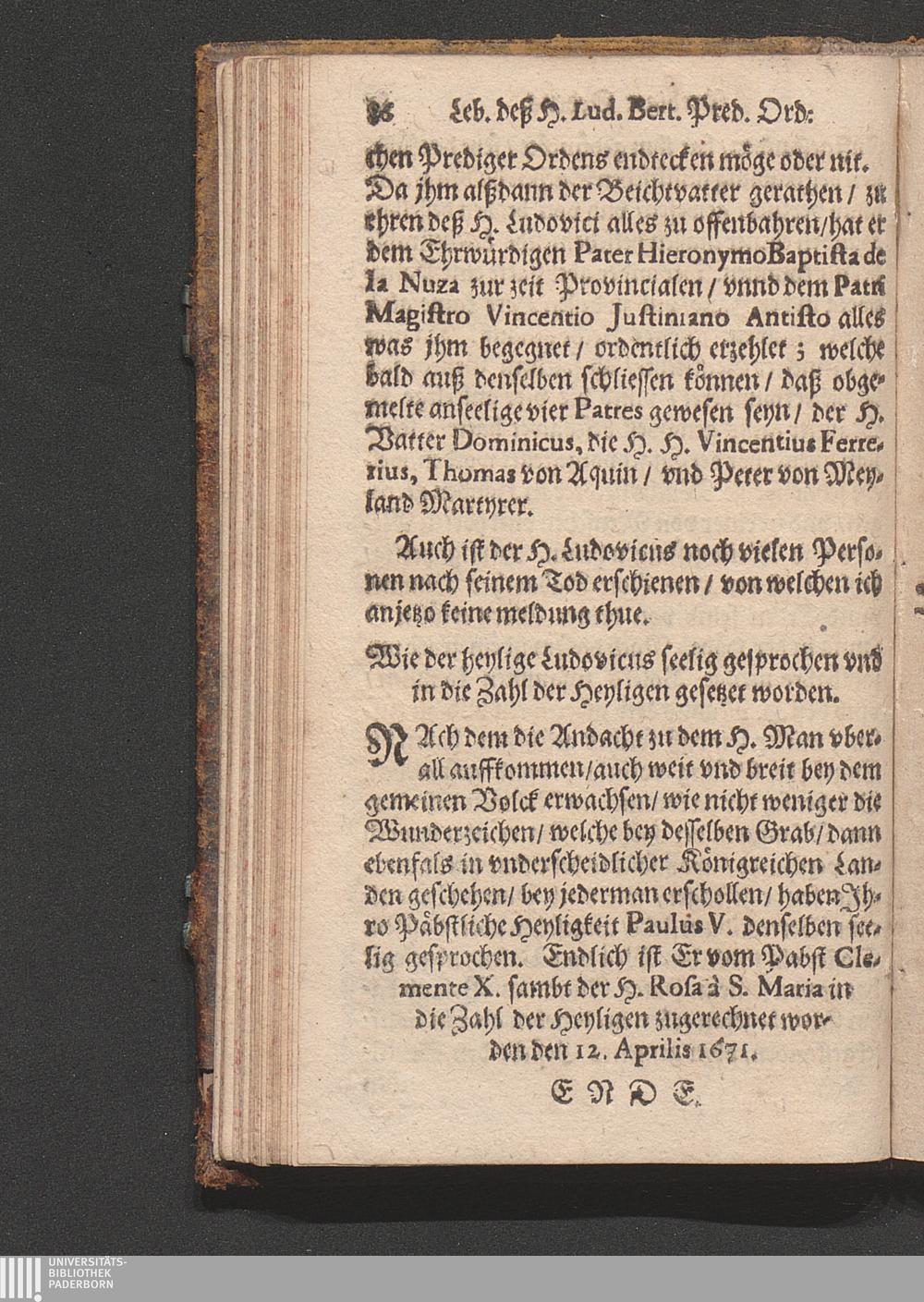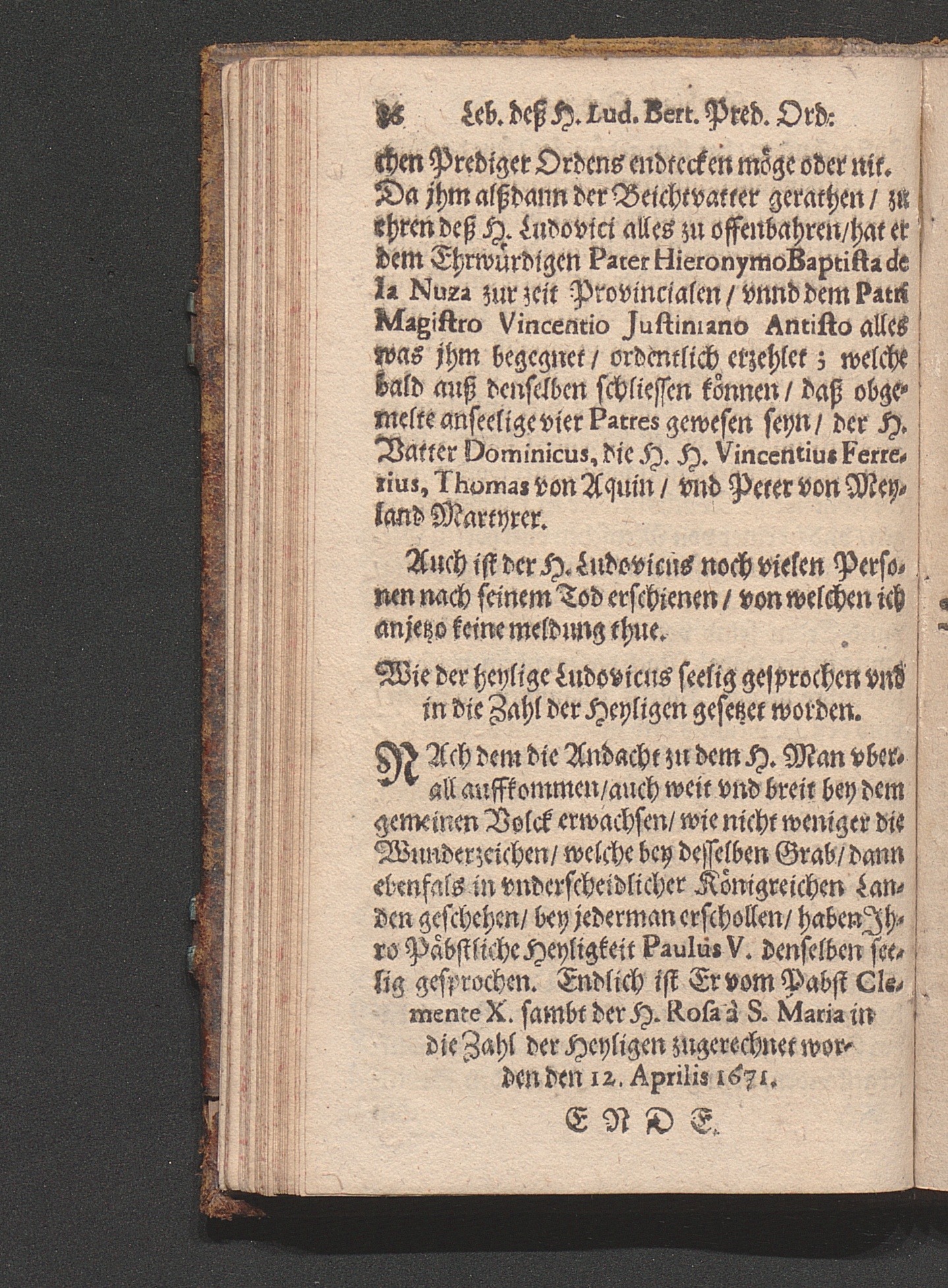 Kurtzer Jnhalt Deß wunderbahrlichen Lebenß deß H. Lvdovici Bertrandi PredigerOrdenß der Occidentalischen Jndianeren Apostels : Welchen Jhro Päbstliche Heyligkeit/ Clemens der X. in diesem 1671. Jahrs den 12. Aprilis mit öffentlicher Canonization in die Zahl der Heyligen gesetzet / [Ambrosius Randing]
