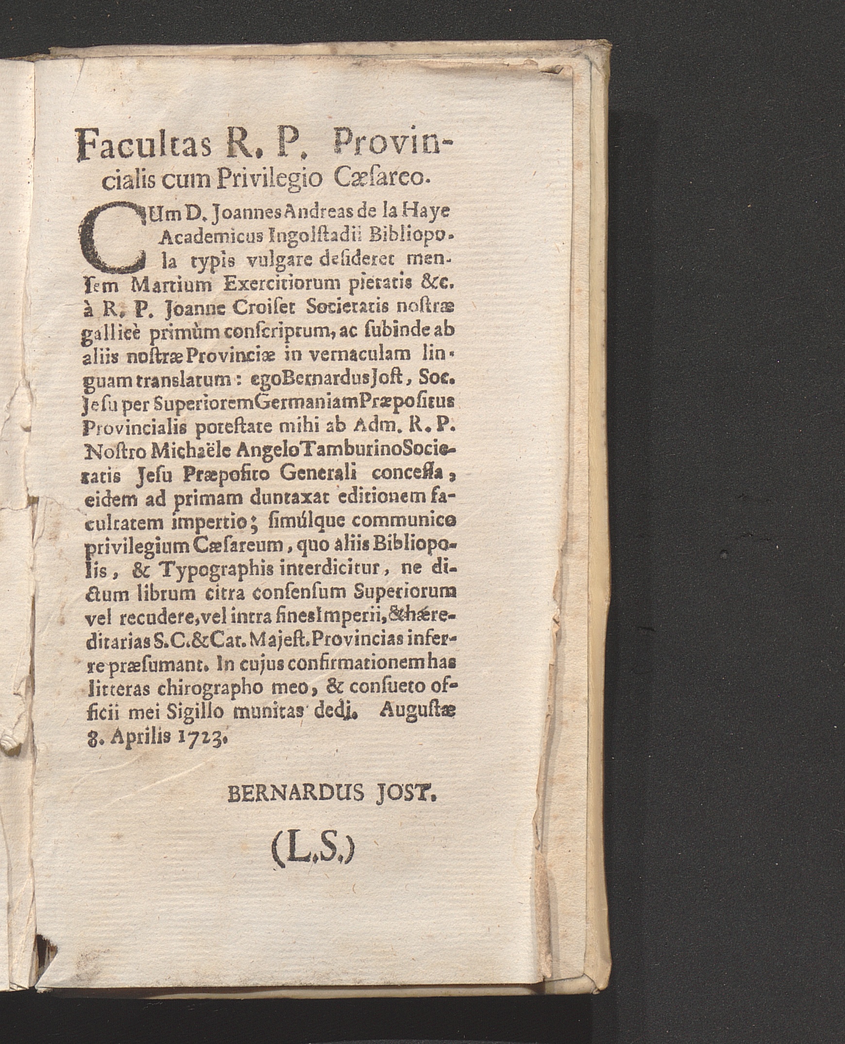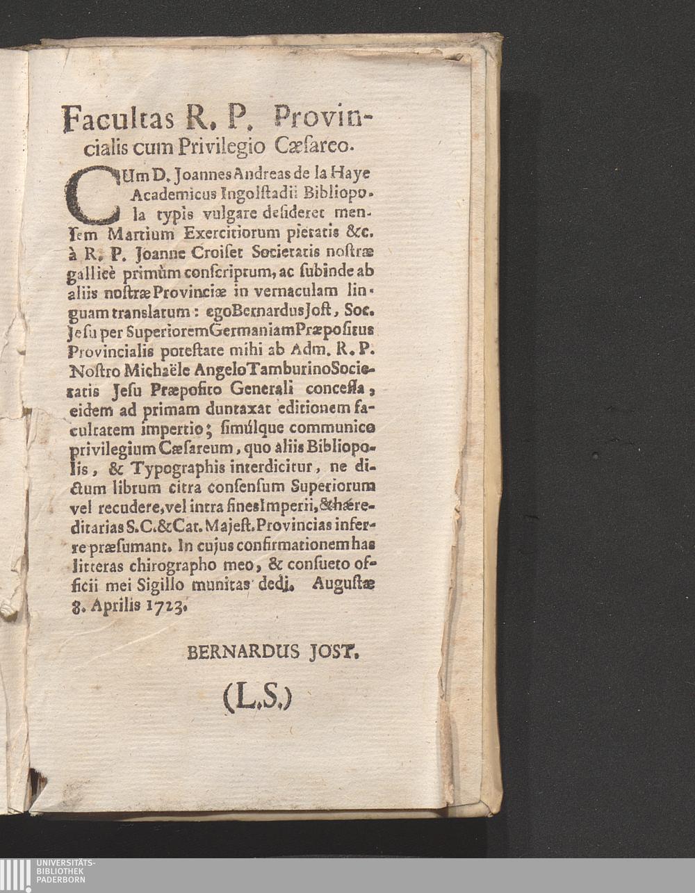 Facultas R. P. Provincialis cum Privilegio Cæsareo.