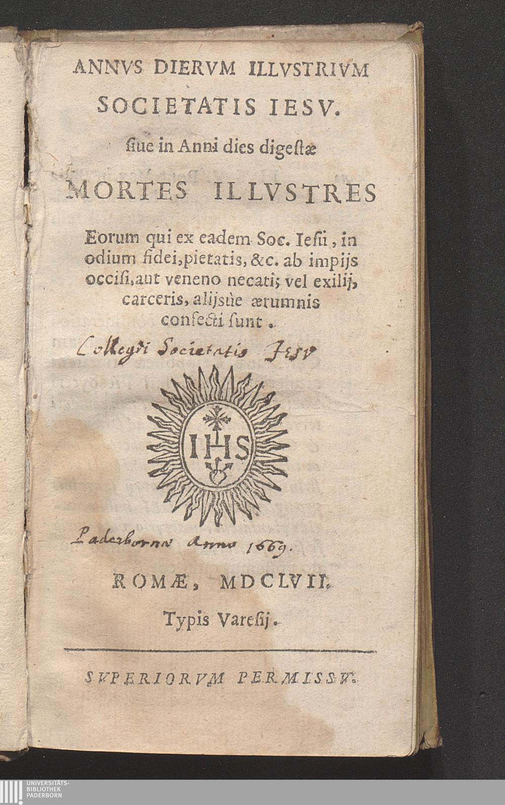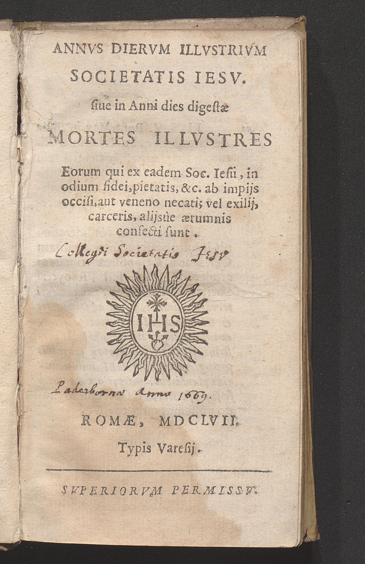 Annvs Diervm Illvstrivm Societatis Iesv. siue in Anni dies digestæ Mortes Illvstres Eorum qui ex eadem Soc. Iesu, in odium fidei, pietatis, &c. ... confecti sunt / [Ioannes Nadasi]