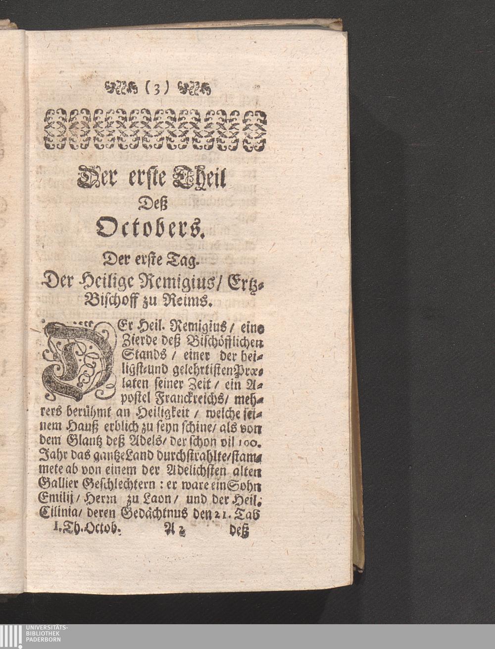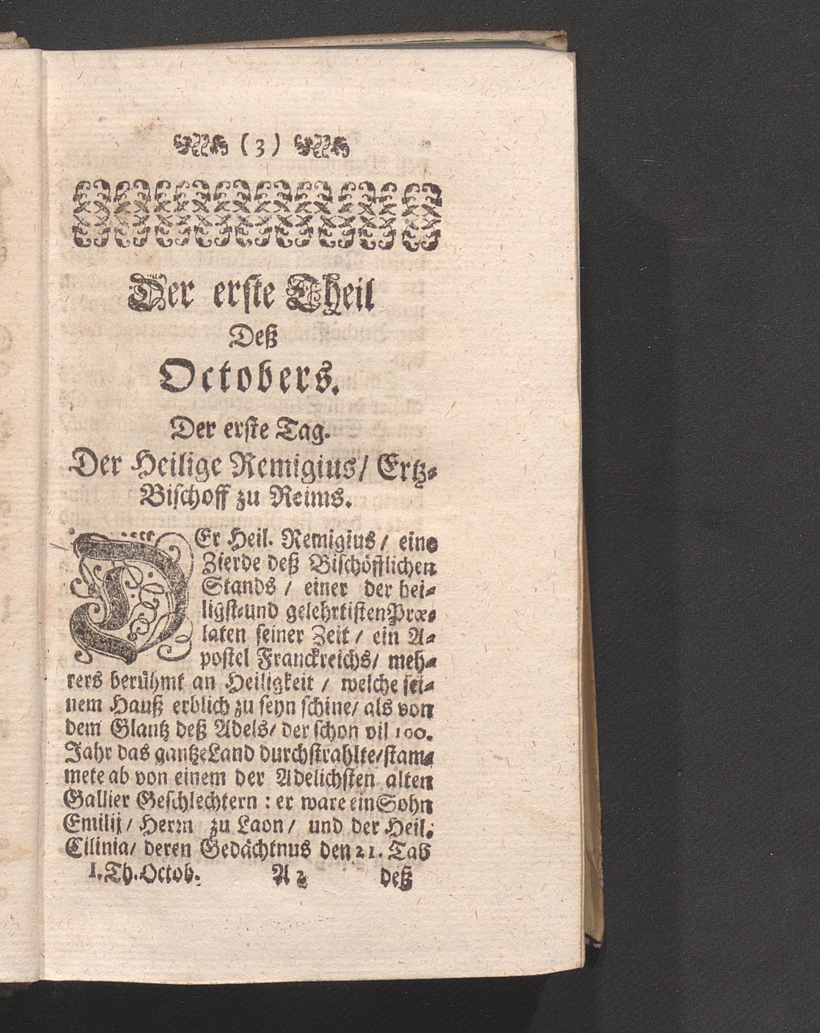 Der 1. Tag. Der H. Remigius/ Ertzbischoff zu Reims. Gebett. Epistel der Heil Meß.[...]