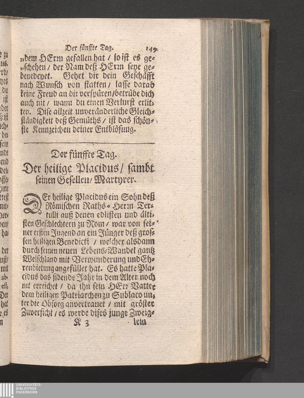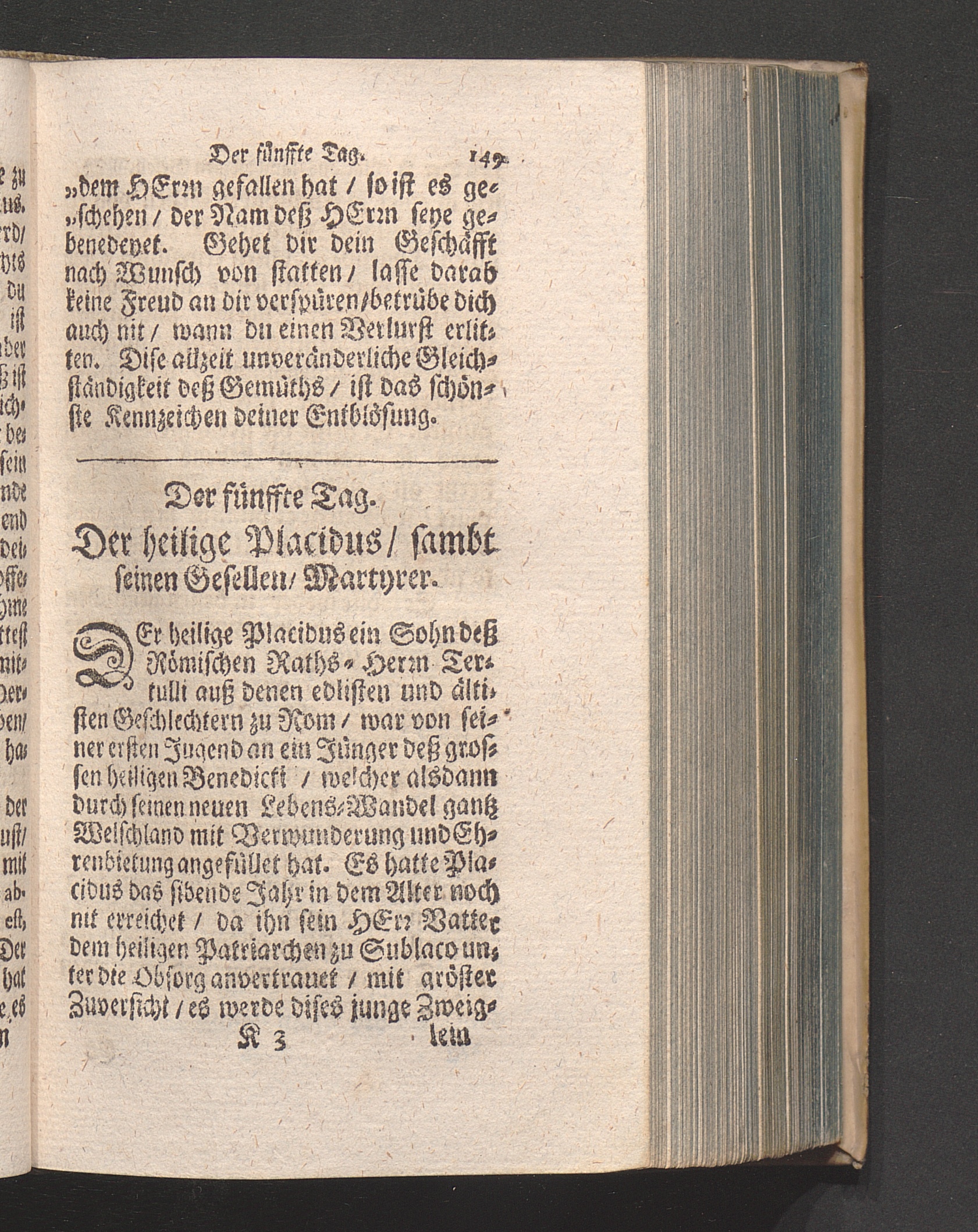5. Tag. Der Heil. Placidus mit seinen Gesellen/ Martyrer. Betrachtung/ von der vilfältigen[...]