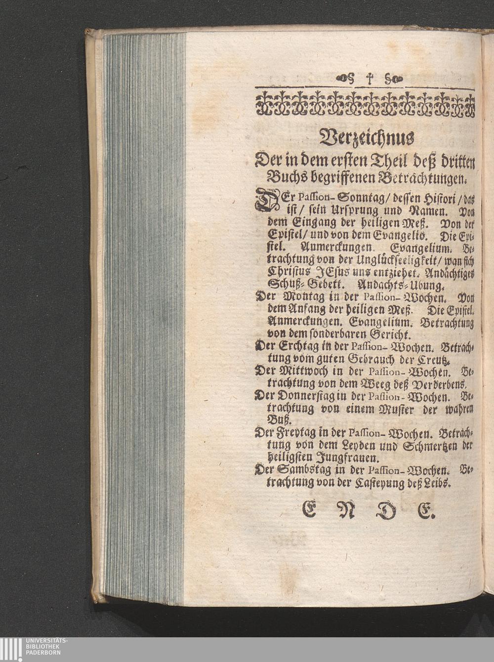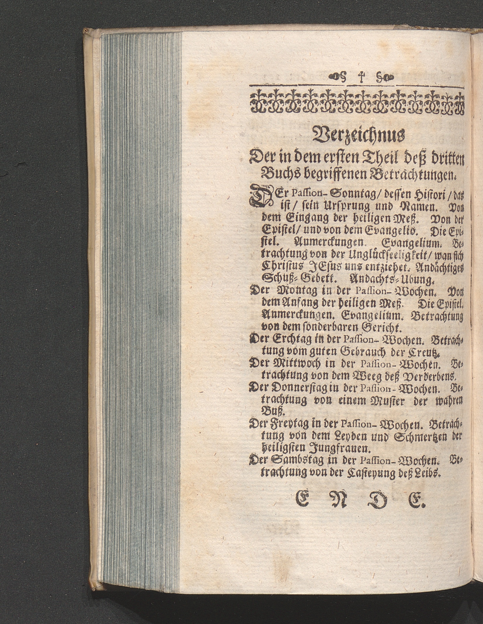Der Passion-Sonntag/ dessen Histori/ das ist/ sein Ursprung und Namen. Von dem Eingang der heiligen Meß. Von der Epistel/ und von dem Evangelio. Die Epistel. Anmerckungen. Evangelium. Betrachtung von der Unglückseeligkeit/ wan sich Christus Jesus uns entziehet. Andächtiges Schuß-Gebett. Andachts-Ubung.