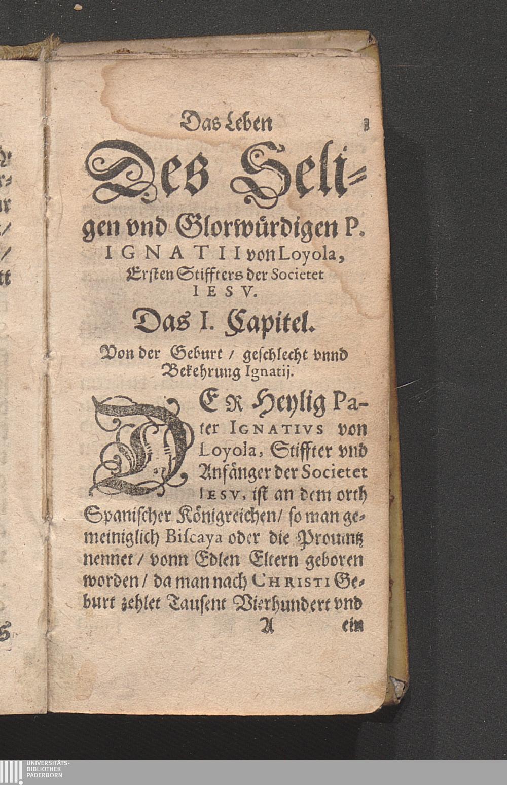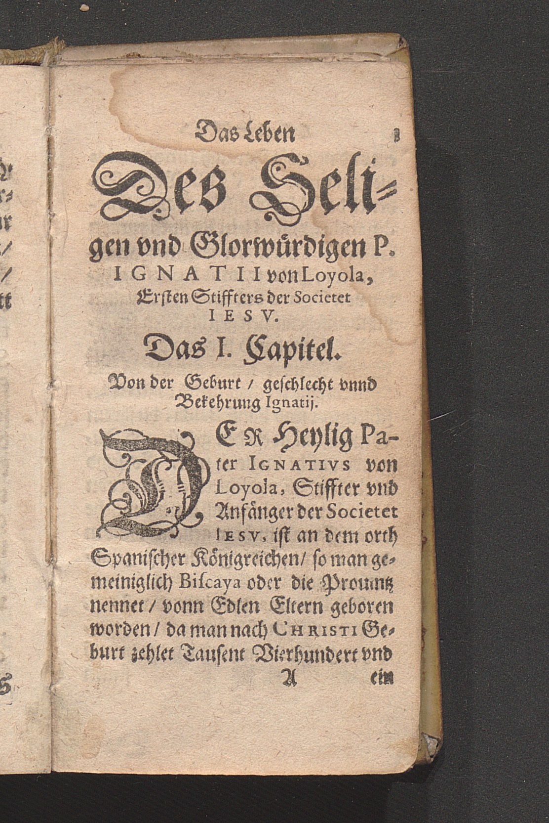 Kurtzer Jnnhalt des Lebens Des Ehr: vnd Glorwürdigen Patris Ignatii von Loyola, Ersten Stiffters der Religion vnd Societet Iesv : Erstlich von P. Petro Ribadenera in Spanischer sprach beschrieben: nachmals in die Welsche/ ferrner in die Frantzösische vnd aus dieser in Teutsche sprach versetzt
