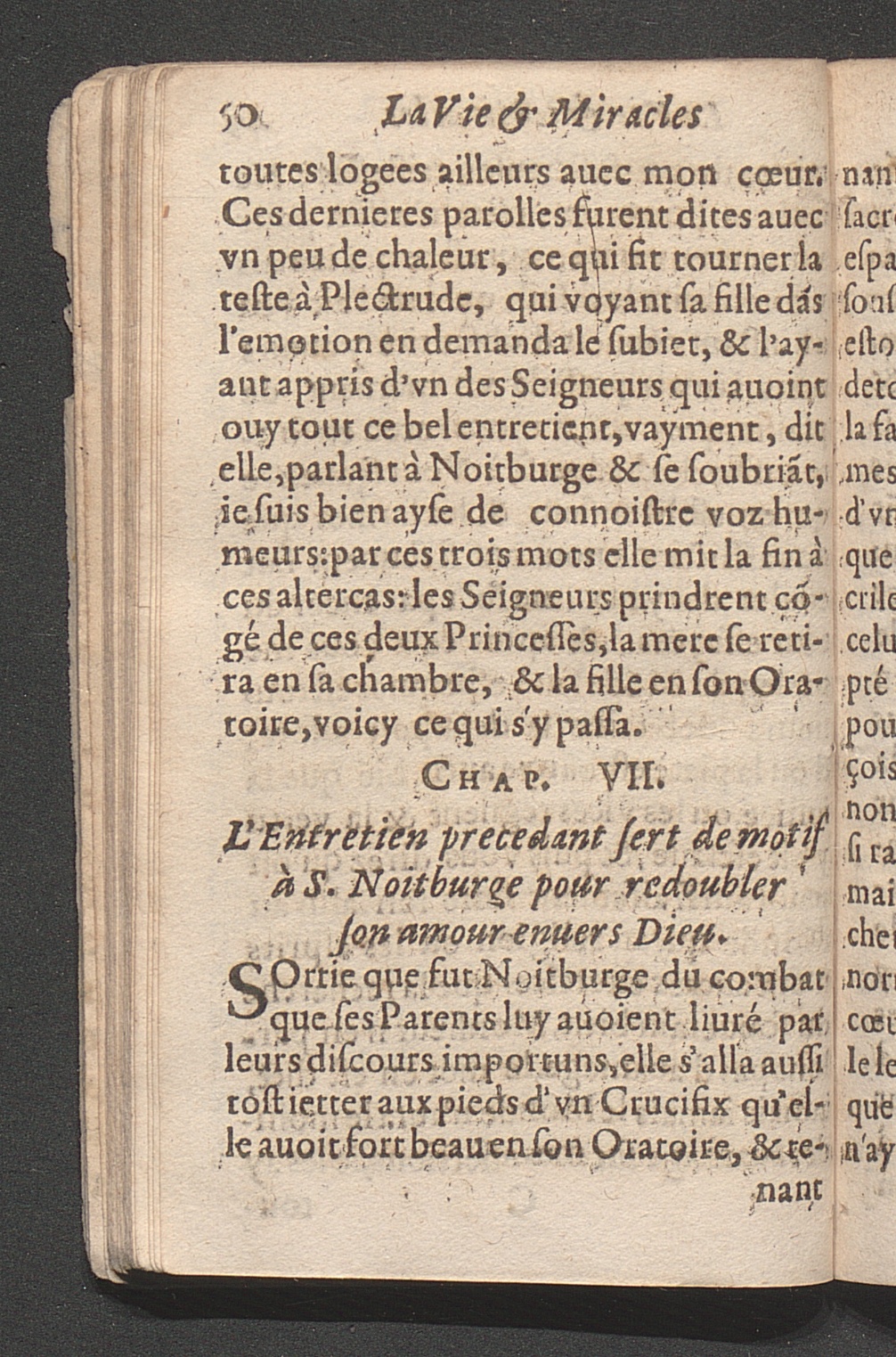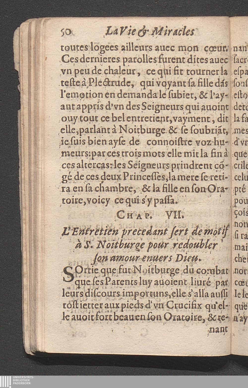 La Vie, Et Miracles Admirables De S. Noitbvrge Fille de Pepin Heristal, & de S. Plectrvde Noble Tige des Serenissimes Maisons de Lorraine & de Bauieres : Le tout enrichi de plusieurs Discours spirituels, & de Documens salutairs, accompagnés de rares Exemples pour l'instruction des ames deuotes / Fait par le P. N. A. D. L. C. D. I.