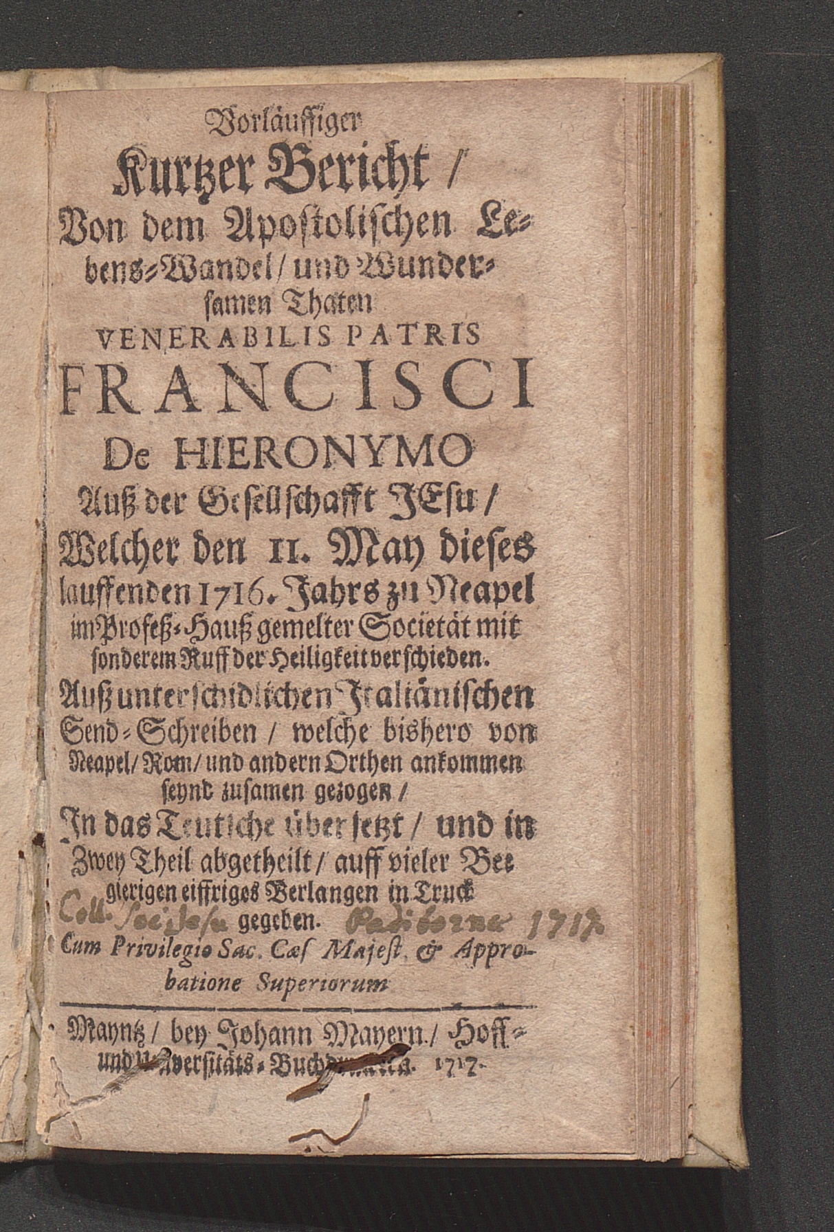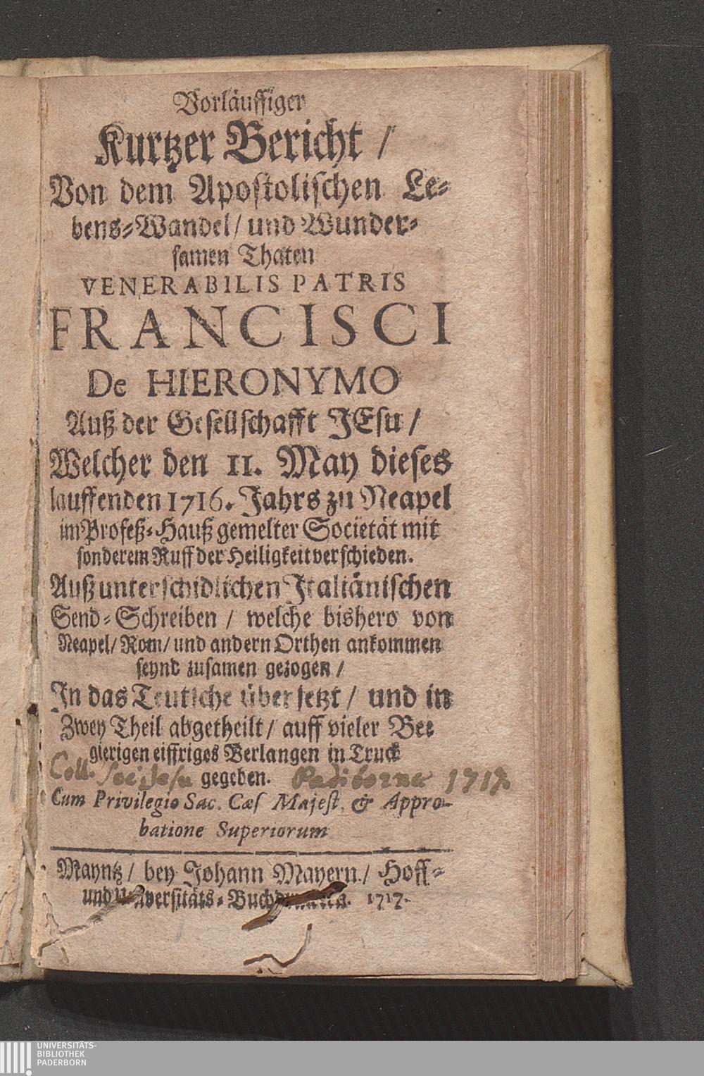 Vorläuffiger Kurtzer Bericht/ Von dem Apostolischen Lebens-Wandel/ und Wundersamen Thaten Venerabilis Patris Francisci De Hieronymo Auß der Gesellschafft Jesu/ Welcher den 11. May dieses lauffenden 1716. Jahrs zu Neapel im Profeß-Hauß gemelter Societät mit sonderem Ruff der Heiligkeit verschieden : Auß unterschidlichen Jtaliänischen Send-Schreiben/ welche bishero von Neapel/ Rom/ und andern Orthen ankommen seynd zusamen gezogen/ Jn das Teutsche übersetzt/ und ... in Truck gegeben